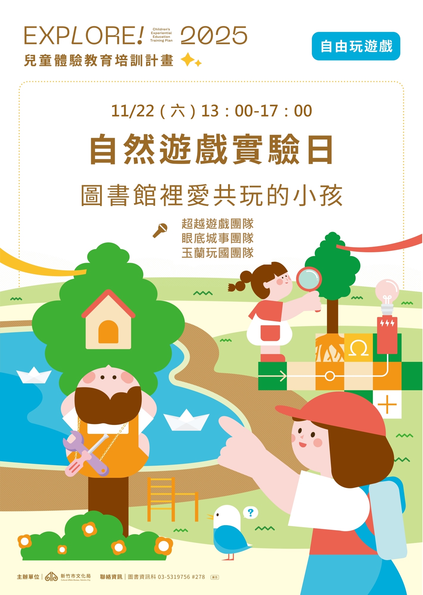 歡迎 #新竹在地 關注自由遊戲、自然探索、兒童教育、 公民參與或兒童表意等議題的大朋友,為自己報名【兒童帶我玩-遊戲工作者如何挺小孩玩自然】講座;也可以和身邊小朋友一起報名參加【自然遊戲實驗日-圖書館裡愛共玩的小孩】工作坊,一起探索又玩耍!ヽ(́◕◞౪◟◕‵)ノ