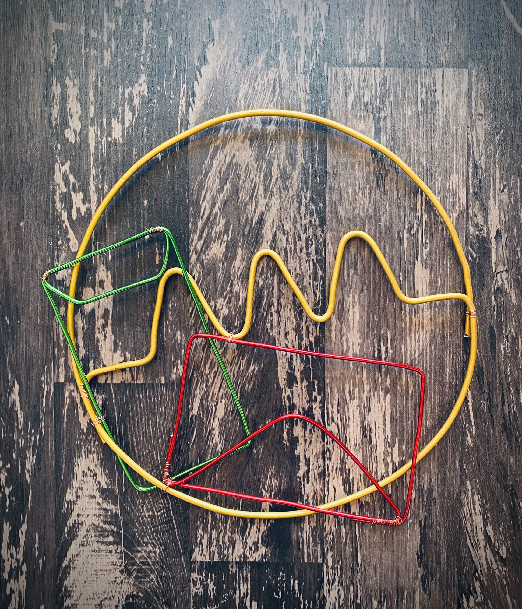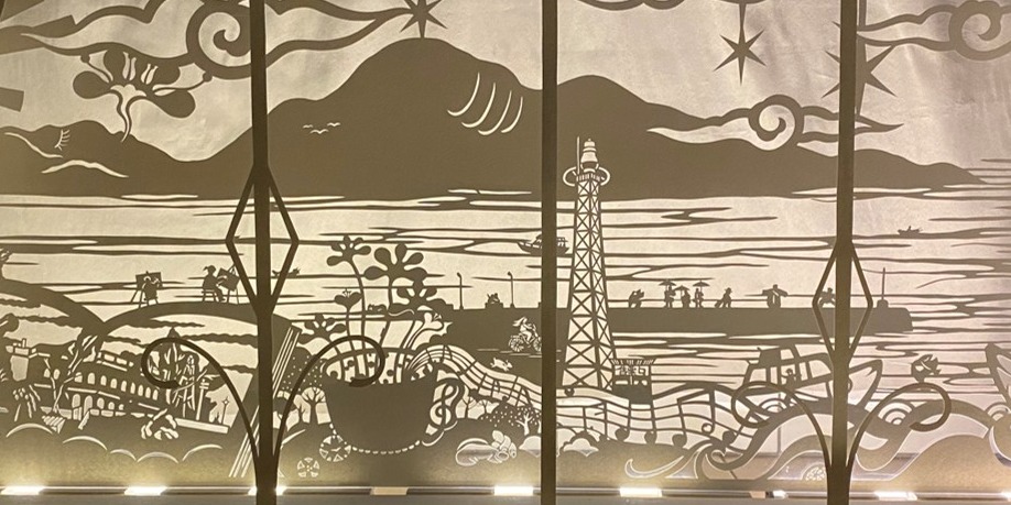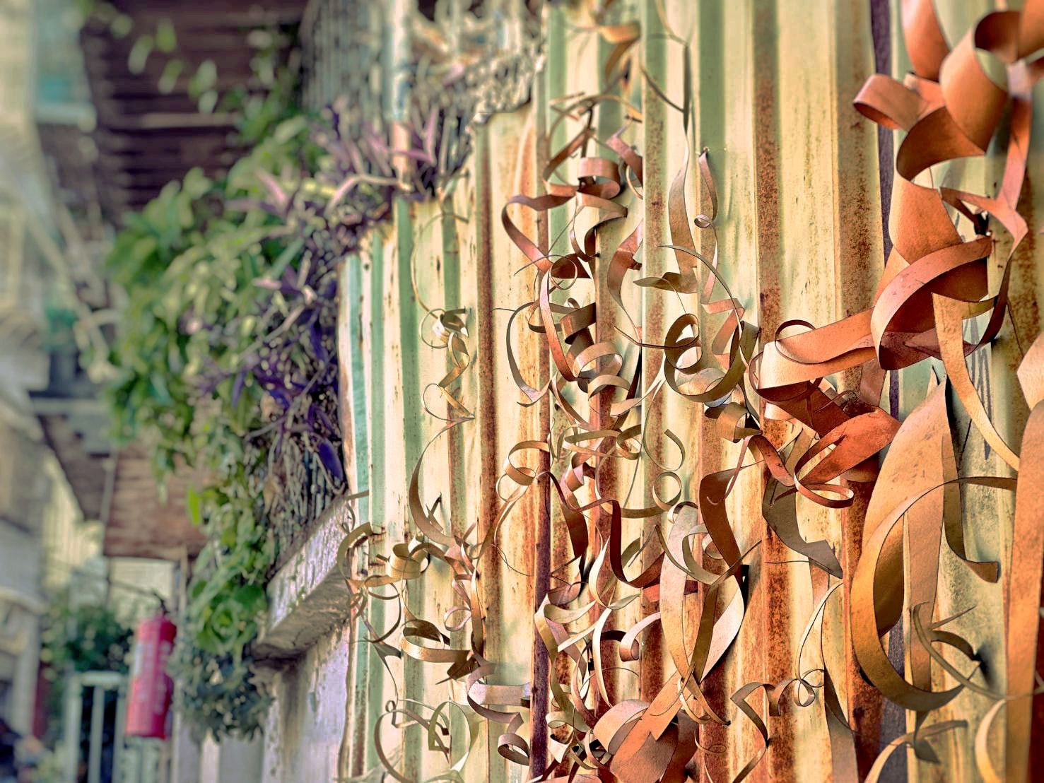循著淡水重建街,我們在此細細觀察街區的鐵窗花、花窗、建築紋飾,並沿途採集街區生活元素,以剪紙為概念,鋁線為素材,運用它輕巧、多彩且可塑性高的特質,將平面畫的構圖變成半立體的作品,妝點淡水街區。以懷古創新的精神,持續創作出在地新風景。