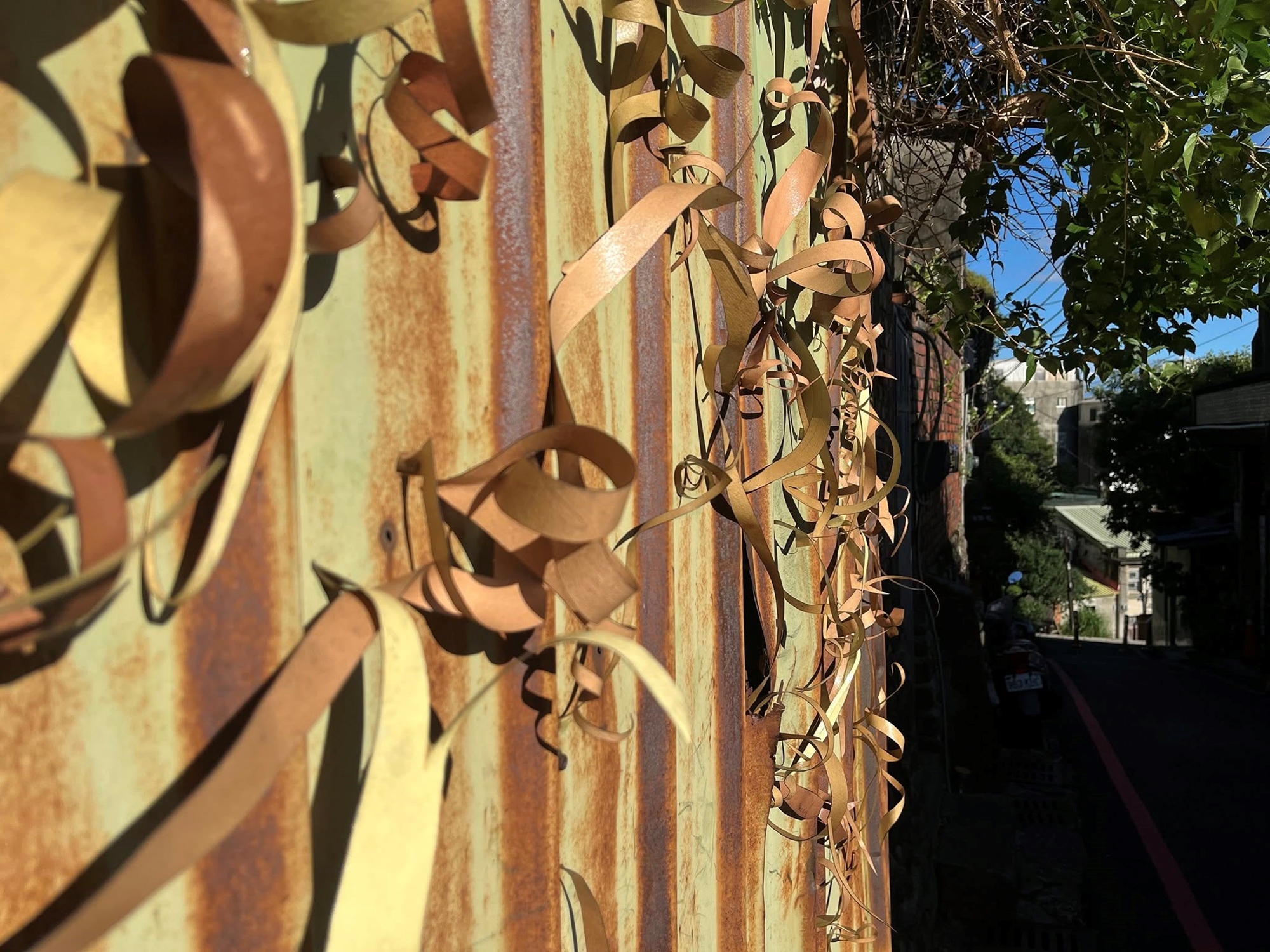 作品選取重建街20號封起的鐵皮位置,採集血桐、苧麻、五節芒、七里香、腎蕨、大花咸豐草等植物進行煮染,以水彩紙浸潤後裁成攀藤造型,裝置於斑駁的鐵皮之上。想像這座植生牆的綠會慢慢長出,與安置上去的作品互相交纏,成為不斷變化的自然書寫。