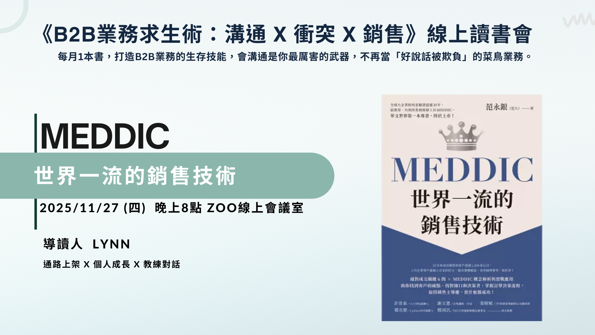 第6場 – 《MEDDIC 世界一流的銷售技術》:國際級的業務套路大公開!深入了解風靡全球 30 年的 MEDDIC 銷售框架,用科學化的方法掌控銷售流程,讓你的業績預測不再靠水晶球 🔮。