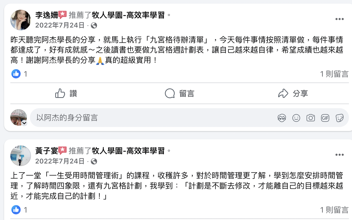 目前已幫助數百位學生,透過高效時間管理心法與工具,擺脫拖延症及手機成癮症,提升目標的達成率,不少學員因此順利考上國考,或在斜槓副業規劃上取得具體成果。