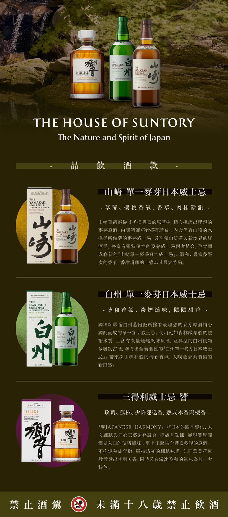 接下來,讓味蕾成為旅程的延續。由三得利全球烈酒公司品牌大使Endy Chen帶領,細細品味山崎、白州、響三款經典威士忌——從香氣到口感,體驗日本威士忌的細膩層次與釀造之美,感受那份職人精神在一口酒中的溫度與深度。