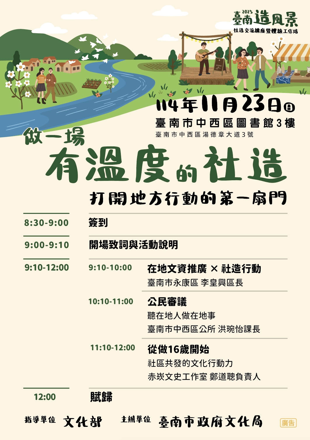 - 本場次活動誠摯邀請社造工作者、青年學子及一般民眾參與,建議16歲(含)以上朋友報名參加。另,本場次座位有限,欲參加者請務必事先報名!