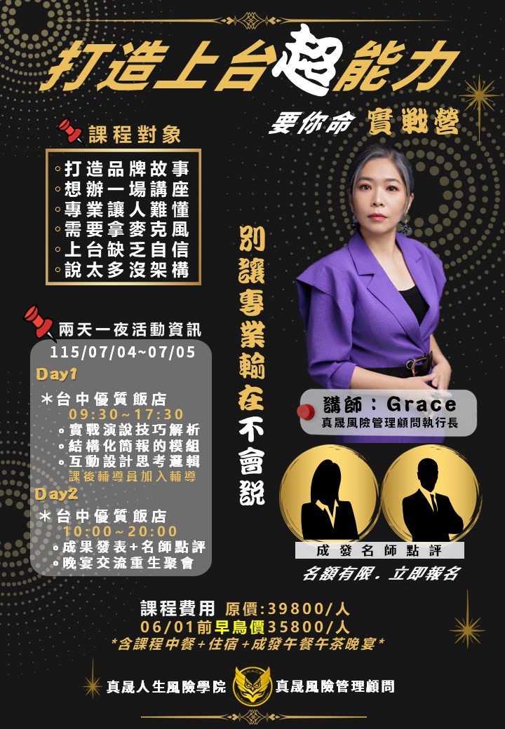 原價$39800/人 早鳥價06/01前$35800 *真晟學院模範生請洽書僮索取優惠代碼*