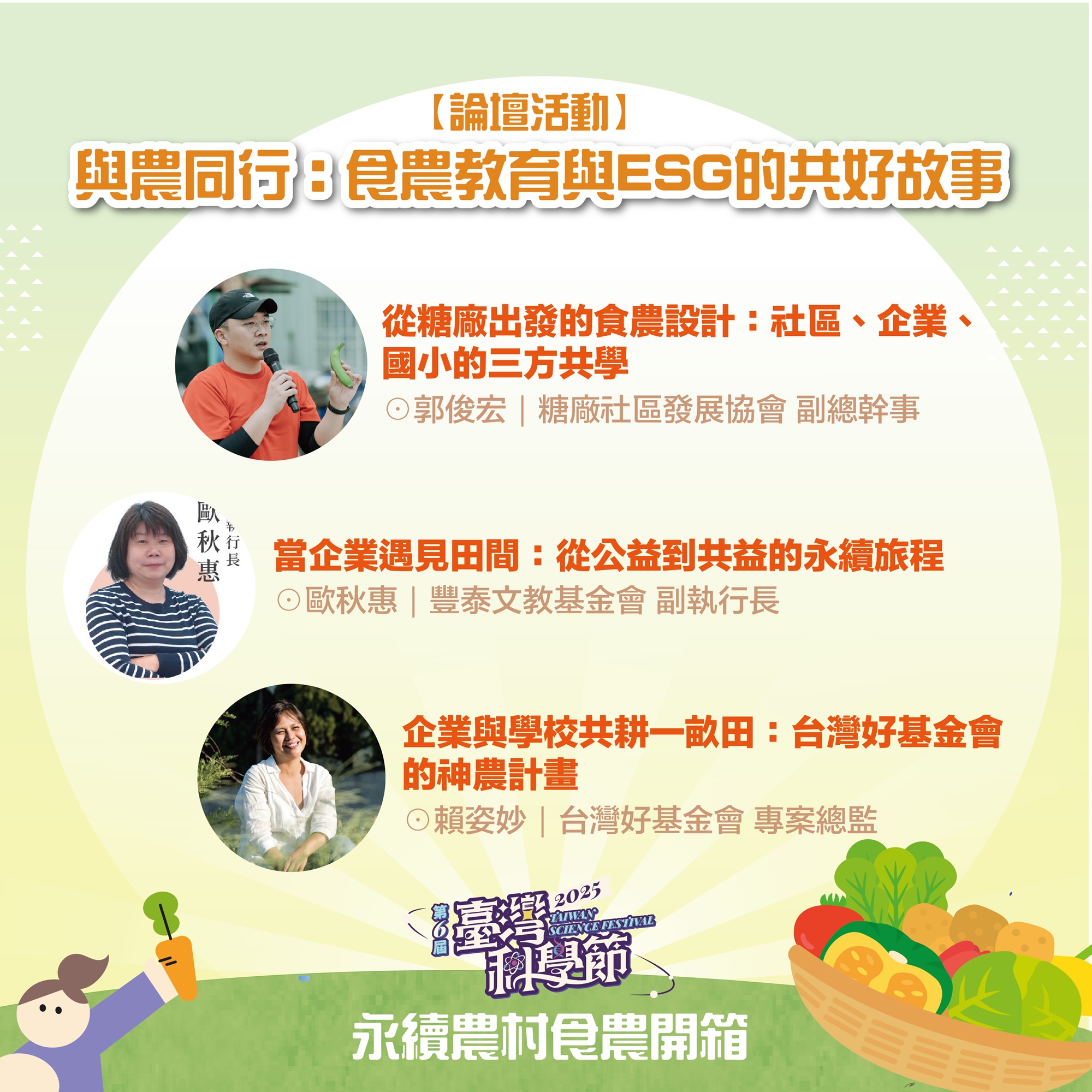 本論壇以「企業共耕・食農共好」為主題,集結政府、企業與社區的多方單位,共同探討食農教育與永續發展的實踐之道。活動由農村水保署開場致詞,揭開跨域對話序幕。由糖廠社區發展協會、豐泰文教基金會及台灣好基金會帶來三場精彩案例,從社區共學、企業公益轉型到校園共耕,呈現食農行動的多元樣貌與創新合作模式。最後綜合討論將匯聚現場觀點,激盪出更多跨界合作的可能,展現臺灣食農永續推動的嶄新能量。