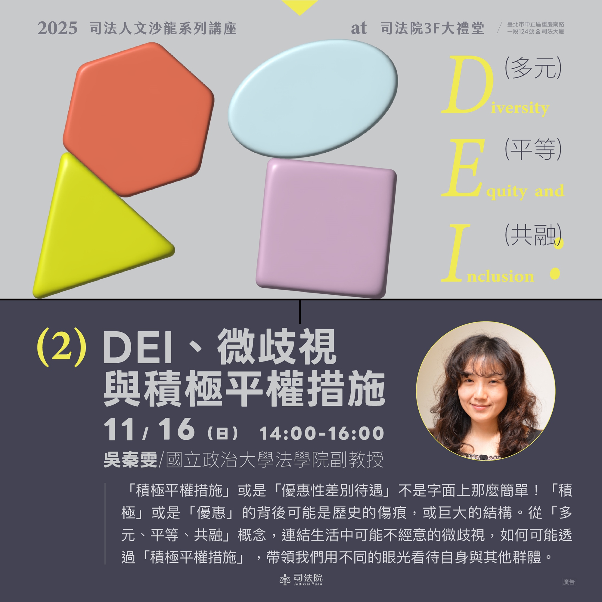 司法院「司法人文沙龍」系列講座,今年以 DEI 作為主題,並舉辦 𝟒 個場次的座談,邀集學者與實務工作者,從他們的研究與實務經驗,說明 DEI 的概念與發展脈絡,期待能與社會大眾共同思辨、交流,DEI 的核心價值,對於你我而言,究竟是互斥的衝擊,抑或是進步的契機?