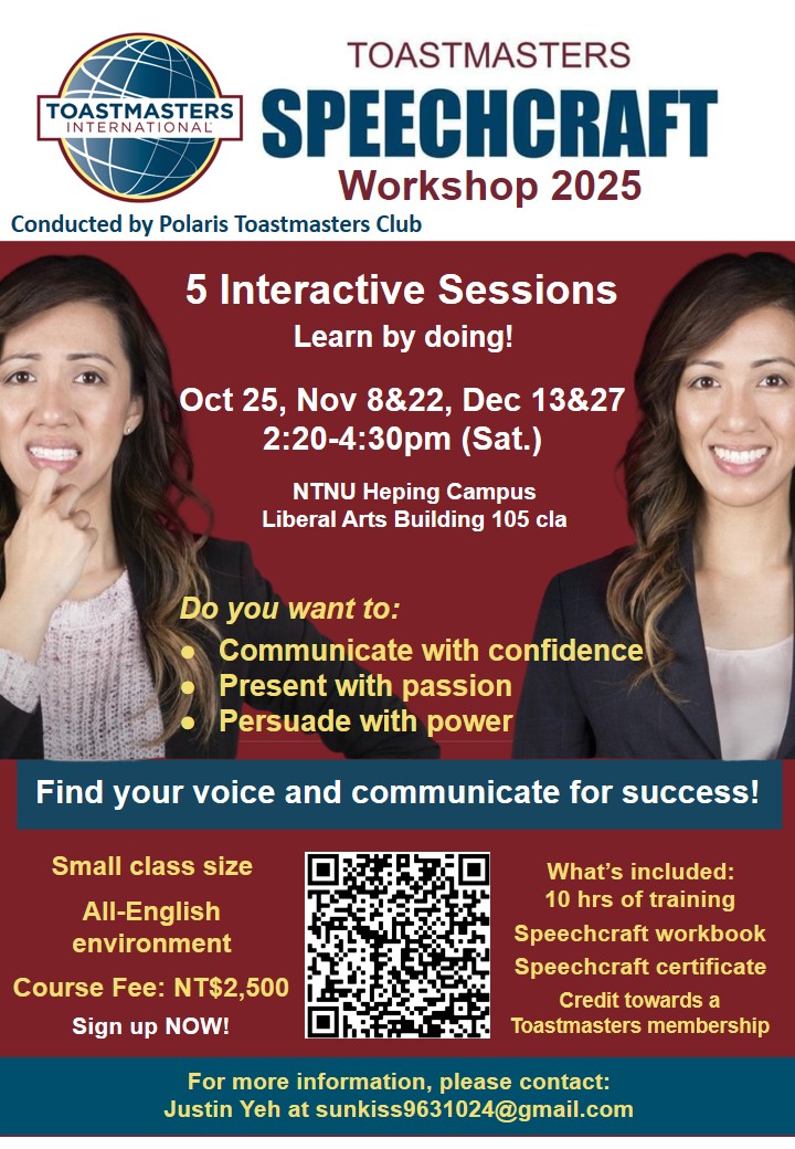 SpeechCraft是為期5次的「演講訓練營」,讓你用輕鬆簡單的方式,體驗Toastmasters的活動!10/25、11/8、11/22、12/13、12/27只要有參加一半以上的課程,就可以拿到證書。