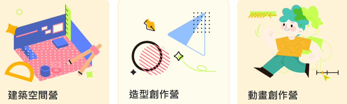 | 透過幾何元素練習空間構成,培養美感法則應⽤與創意思考; 期待學員表達個⼈情感,如愉快或神秘,融入趣味故事元素。 | 應⽤基礎技能設計功能性空間,理解觀賞空間(如美術館)的流線、照明與互動,提升問題解決與團隊討論能⼒。 期待創意如互動展區,連結現實如博物館參觀經驗。 |