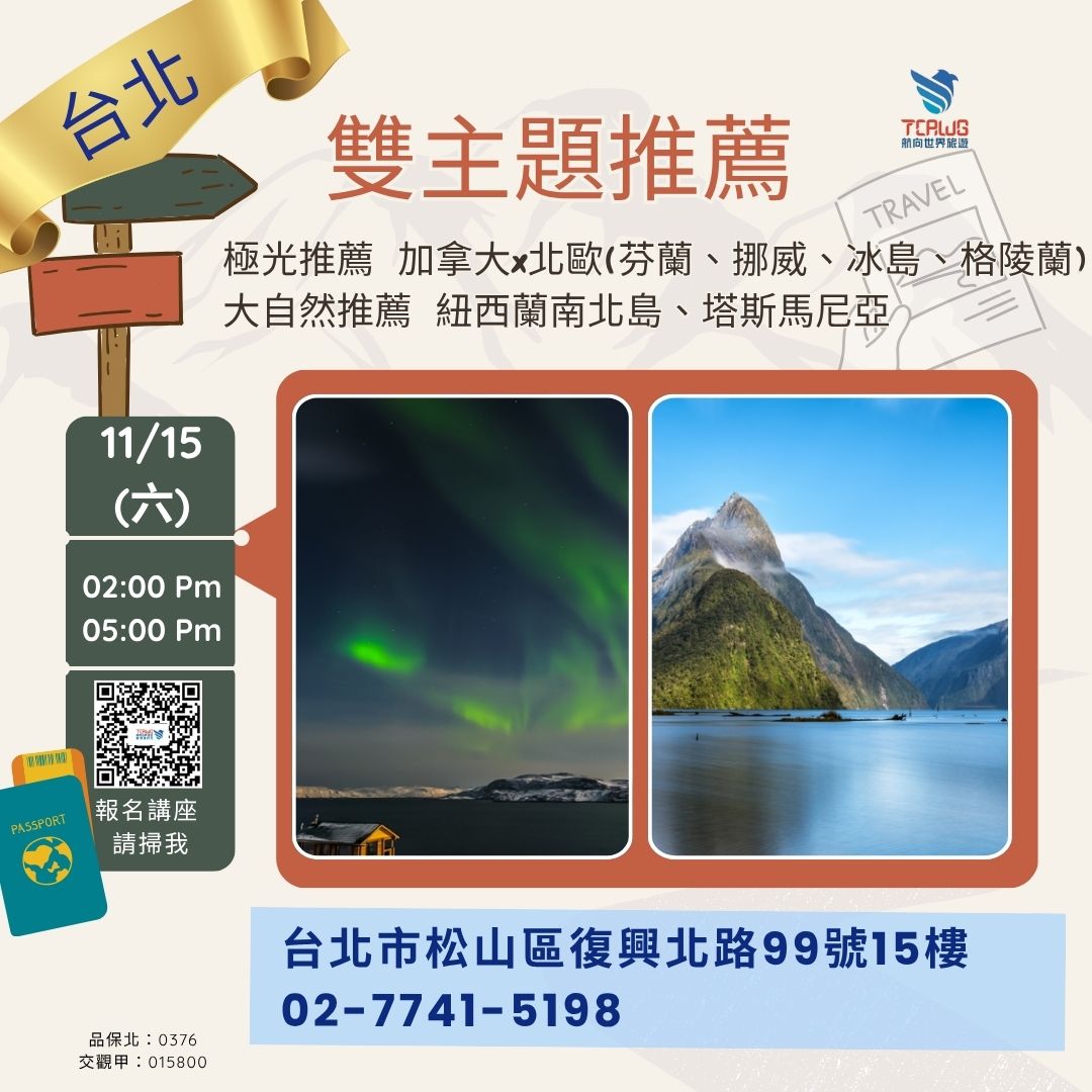 - 講座主題:極光推薦(加拿大x北歐) & 大自然推薦(紐西蘭x塔斯馬尼亞)
