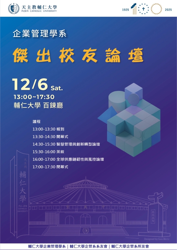 欣逢輔仁大學建校百年,企管系將於2025年12月6日(六) 13:00至17:30在輔仁大學百鍊廳舉辦「傑出校友論壇」,特別邀請在各領域具有傑出成就的學長姐,與在校師生分享寶貴經驗與見解。論壇當日安排主題座談,期能透過交流與對談,啟發與會先進們的學習視野與未來規劃。