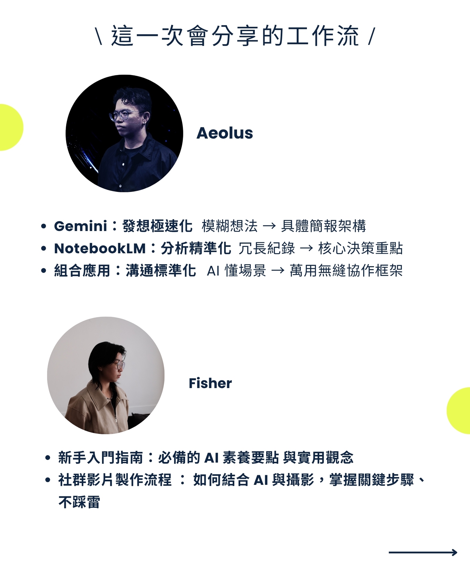 這次活動將由兩位講者分享,有關AI經驗上的工作流程
