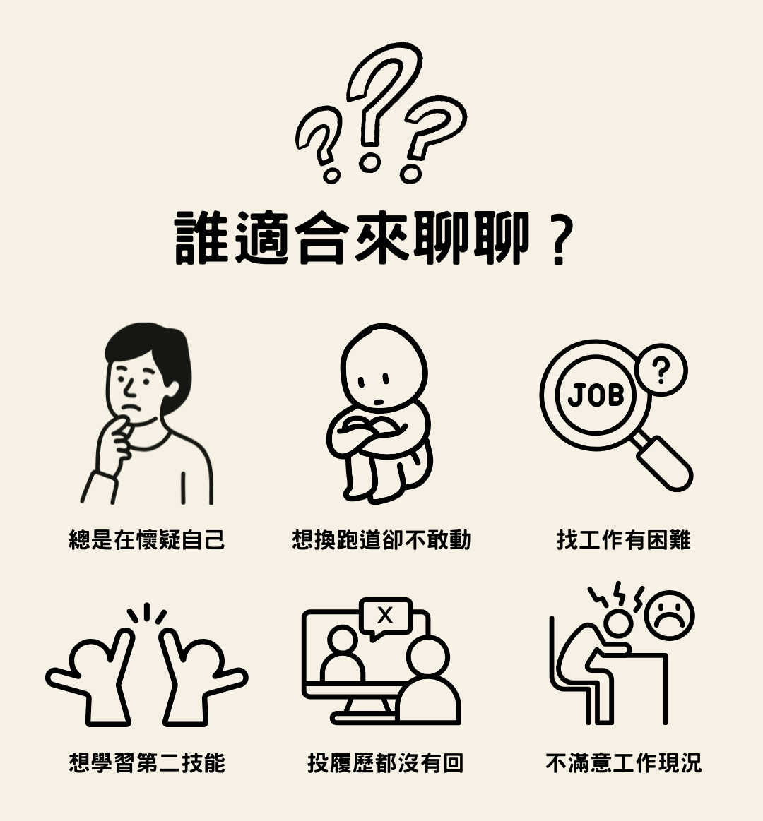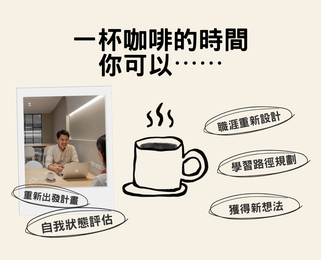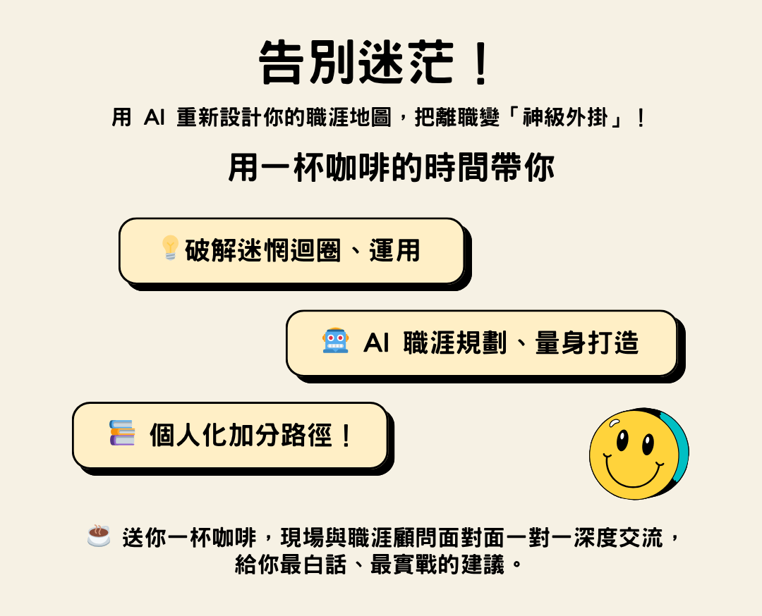 告別迷茫!用 AI 重新設計你的職涯地圖,把離職變「神級外掛」! 用一杯咖啡的時間帶你💡破解迷惘迴圈、運用 🤖 AI 職涯規劃、量身打造 📚 個人化加分路徑! ☕️ 送你一杯咖啡,現場與職涯顧問面對面一對一深度交流,給你最白話、最實戰的建議。