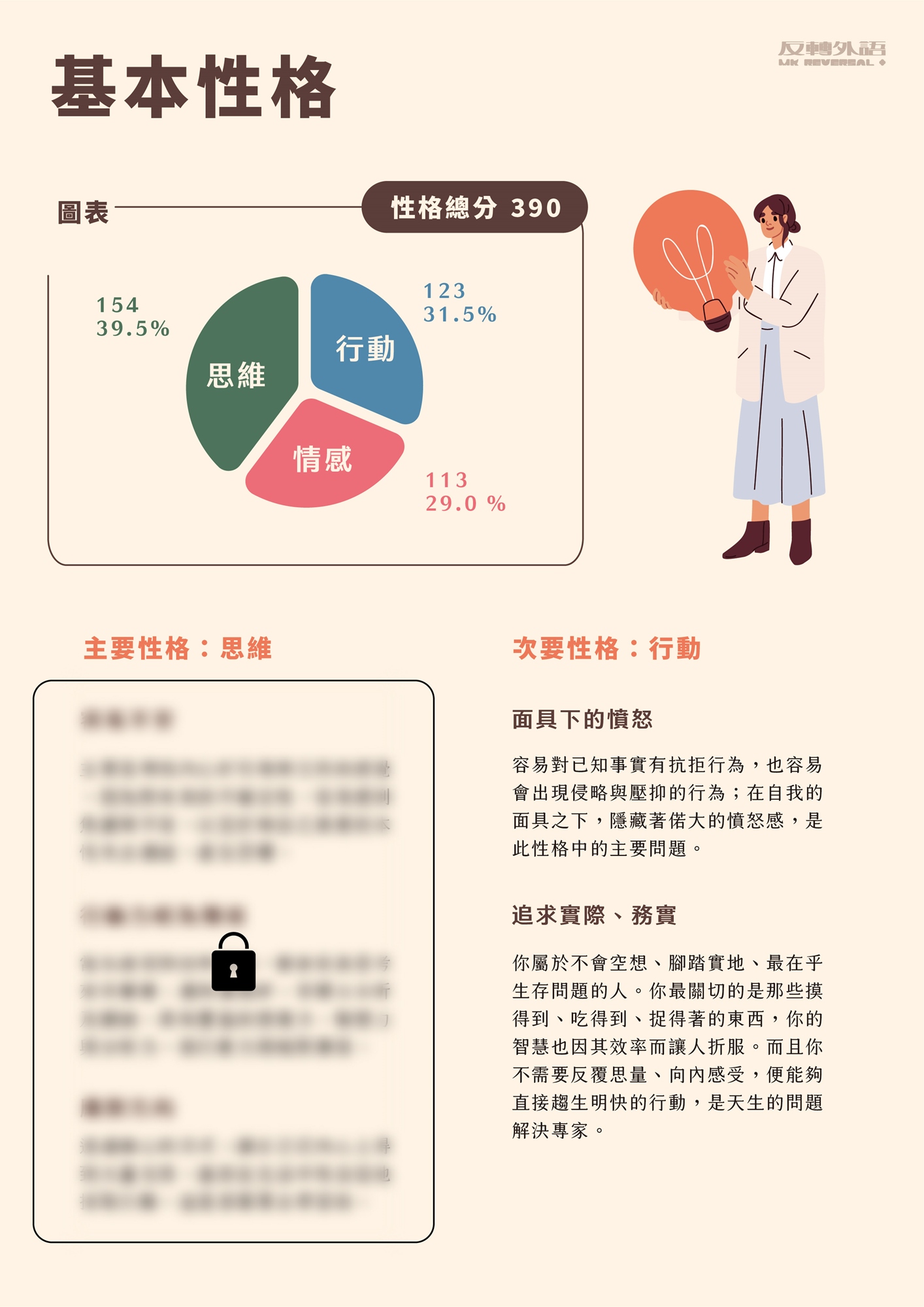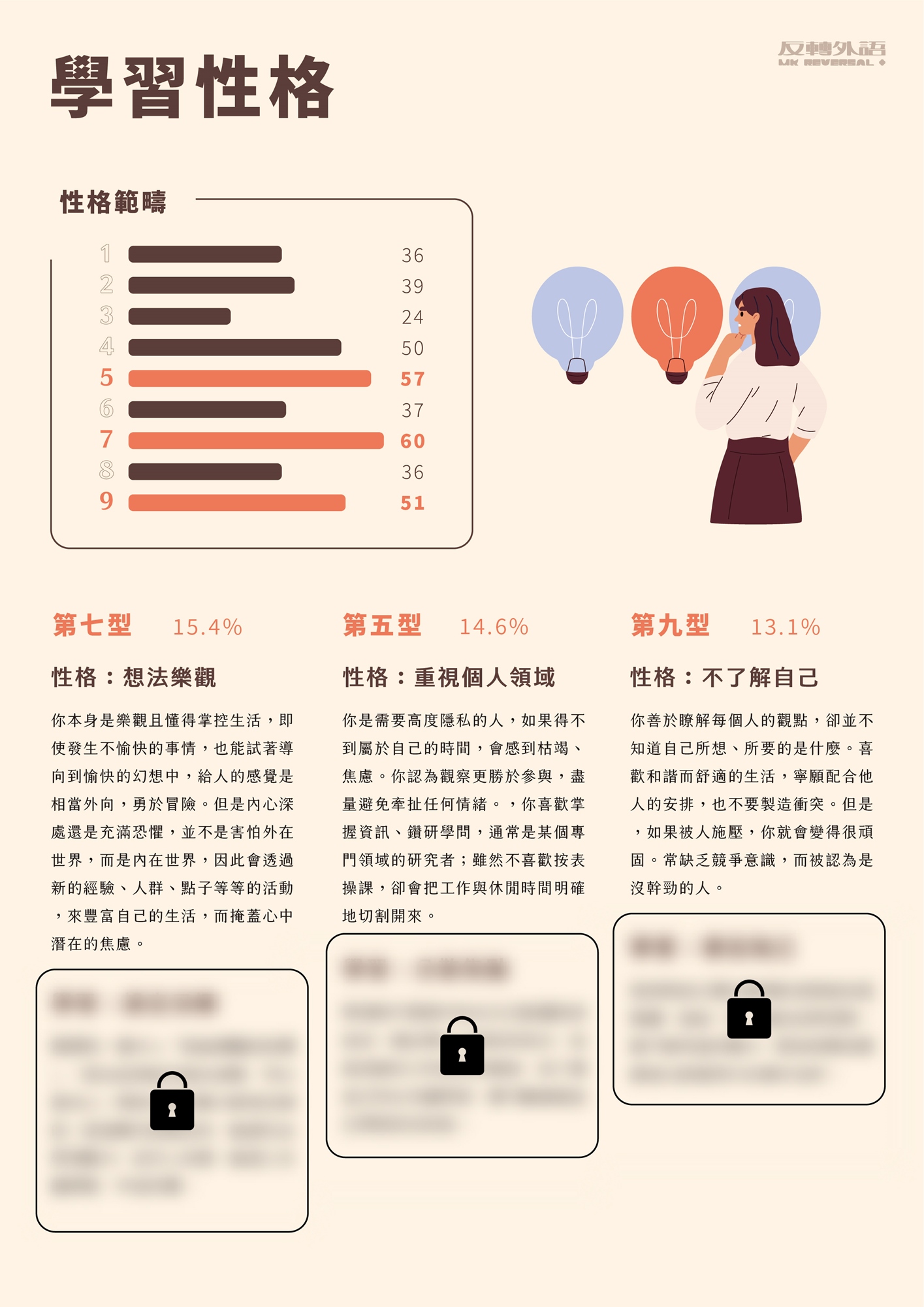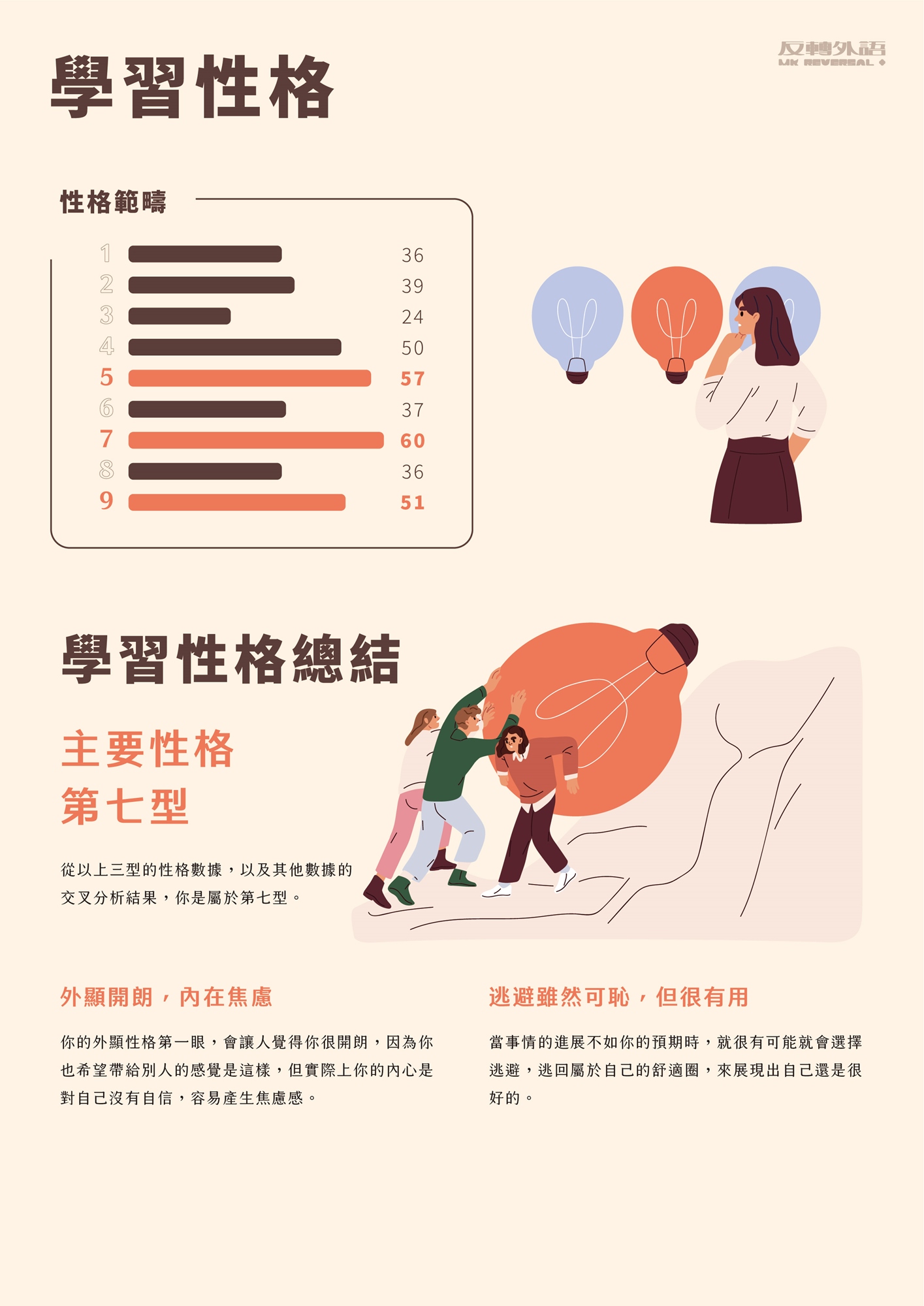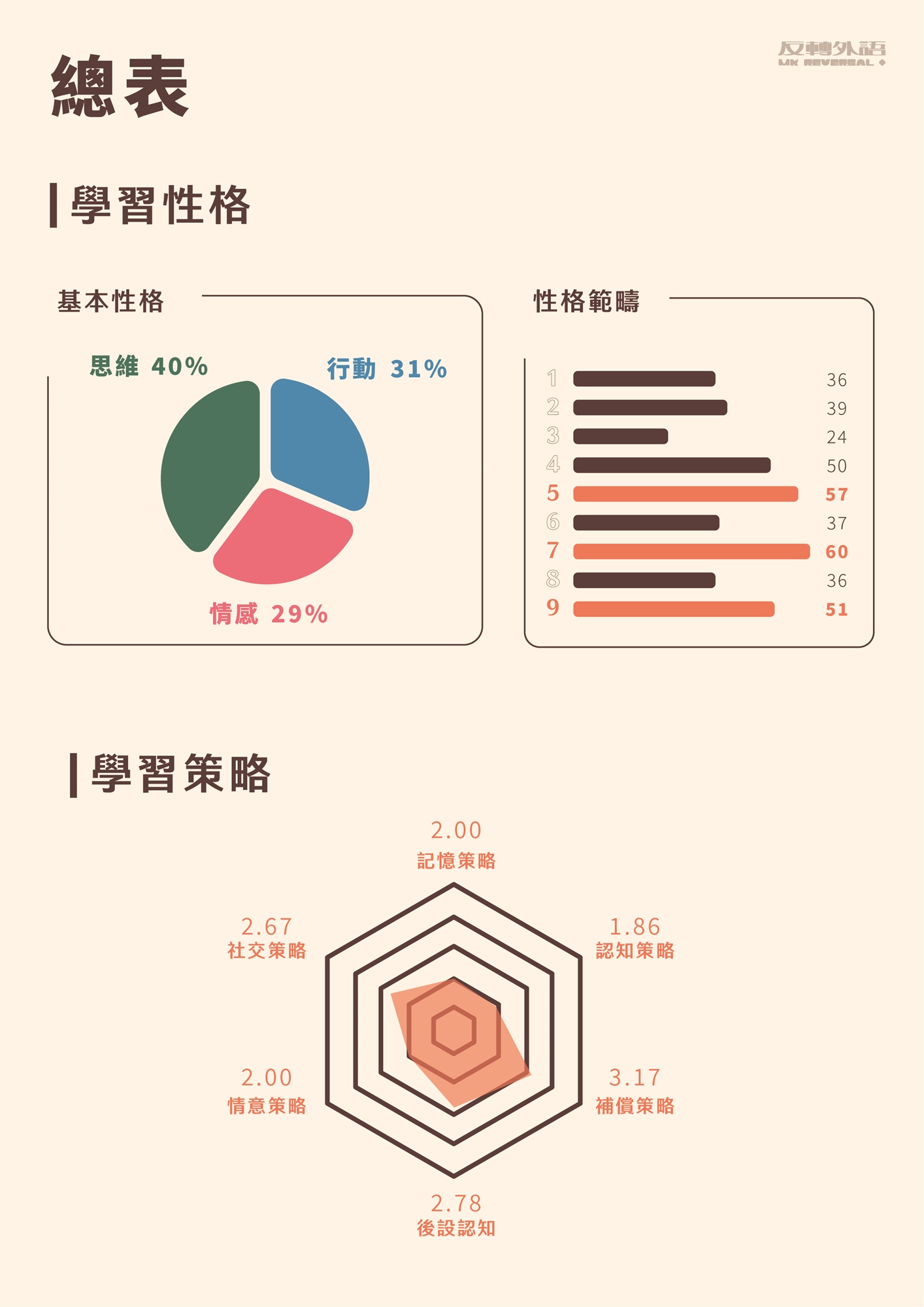 學習性格是從學習者的學習方式區分為:「思維人」、「情感人」、「行動人」等三大類別,每個類別細分成三種型態,透過學習性格檢測你將可以清楚掌握 容易遇到的學習問題、性格佔比分析、學習改善方針、完整學習規劃。
