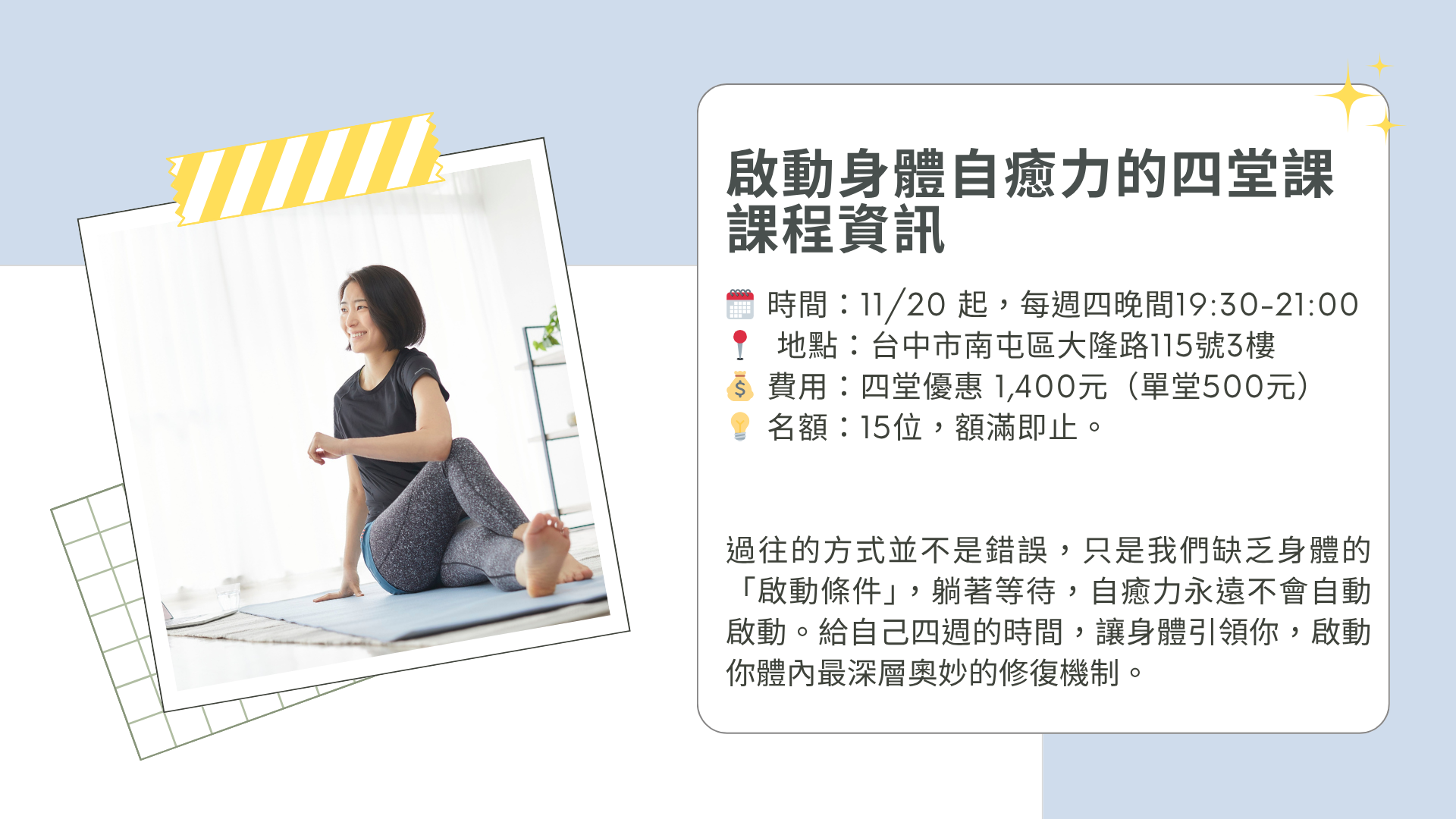 👉🏻 低品質睡眠等於持續消耗。你需要的是深度修復呼吸,透過身體與重反力,讓能量重新流動,將過去累積的疲憊釋放開來。