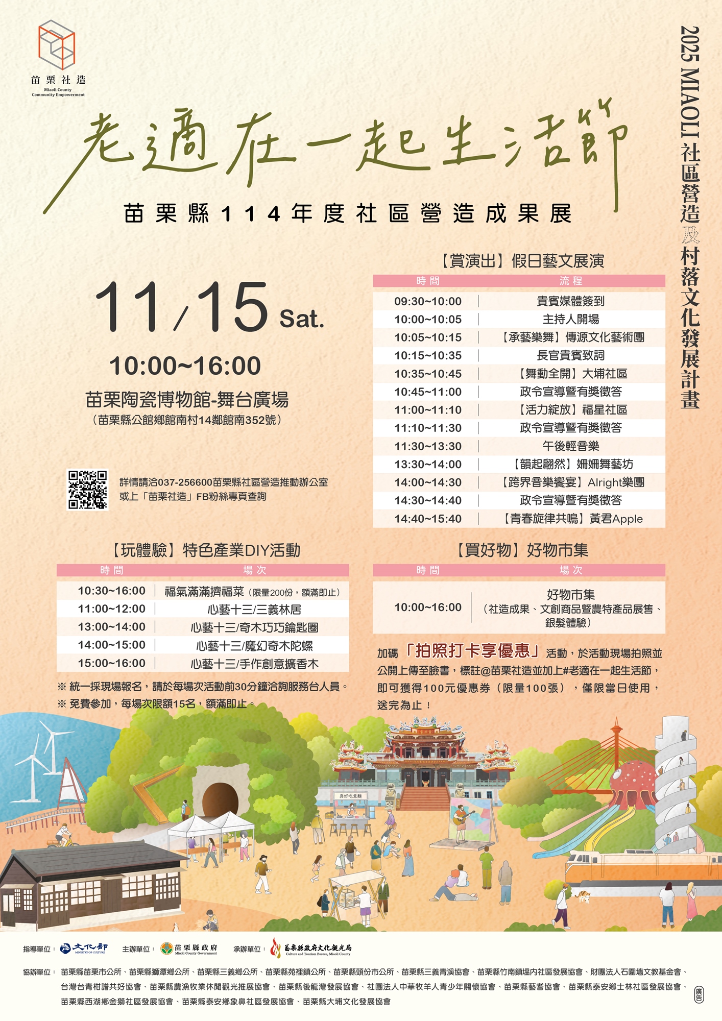 ✔ 「老適在一起生活節」是傳達的一個精神,旨在打造一個適合長者生活、青年返鄉的良好環境,感謝公所、社區、青年、產業等各界傑出人才的共同努力,為文化扎根付出心力,才能創造共榮共好的產業及居住品質,歡迎大家來共襄盛舉這場精彩的苗栗人文盛宴。