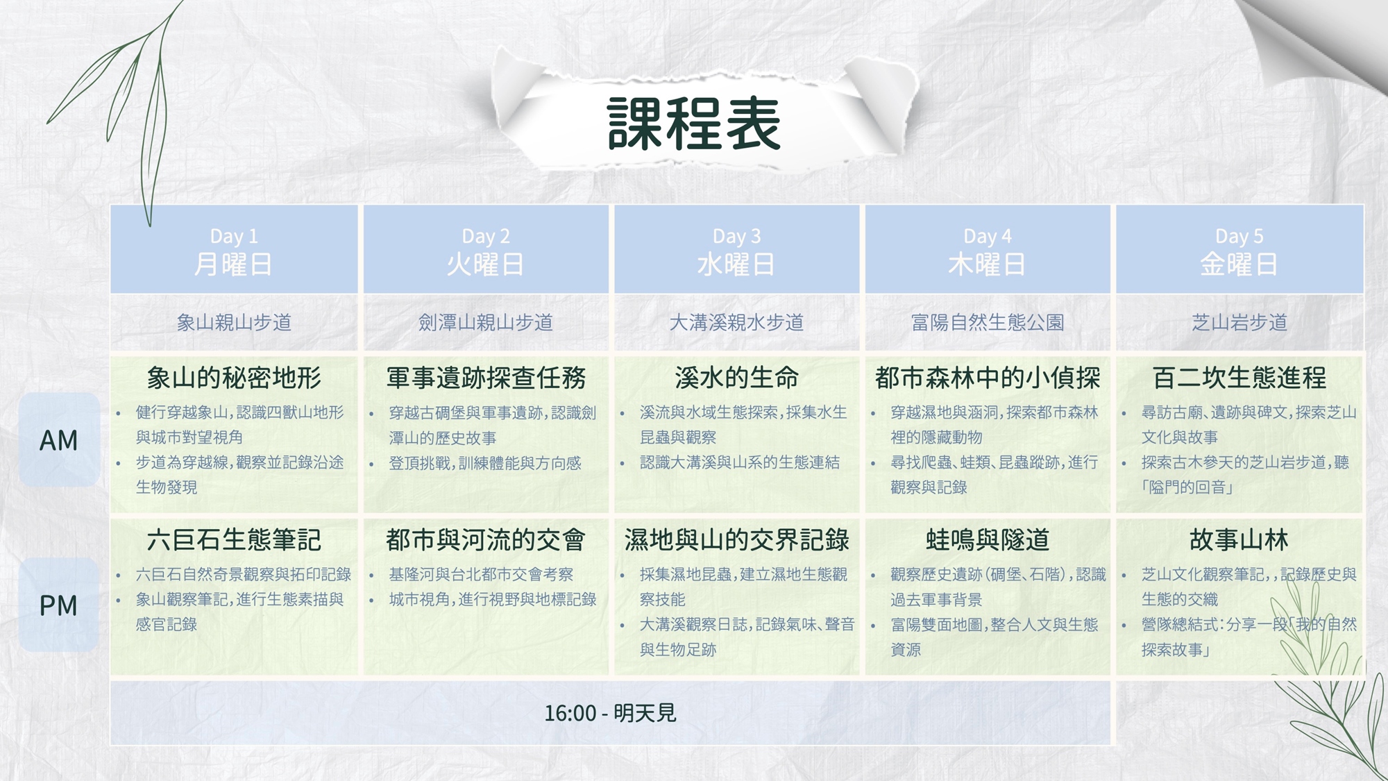 - 小雨並不影響活動進行 (請依行前通知準備雨具等裝備),營隊課表視天氣狀況彈性調整活動單元,如遇大雨天氣,則改進行室內自然觀察學習課程