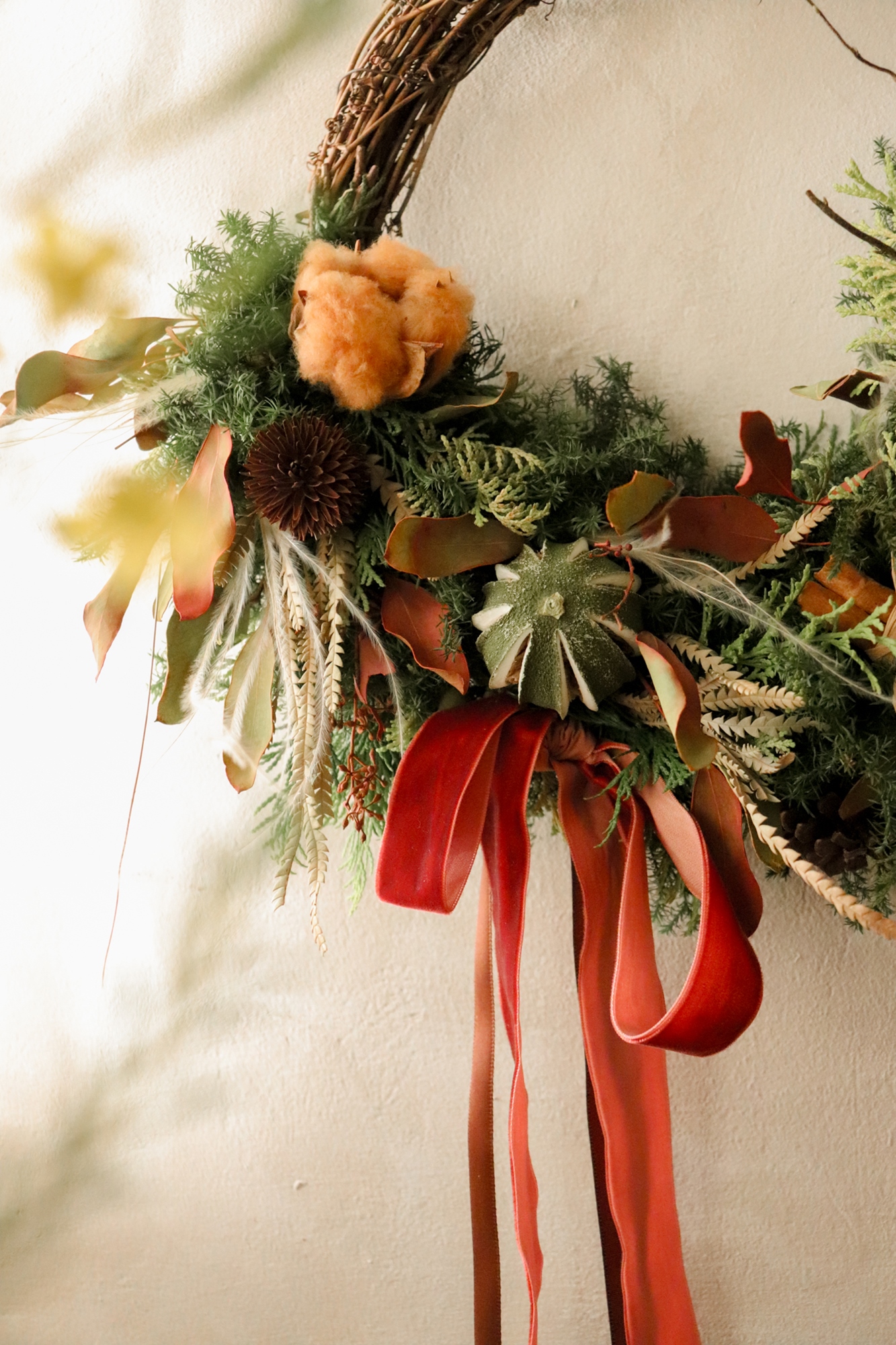 結合變色的尤加利葉與棕色的棉花搭配綠色的雪松