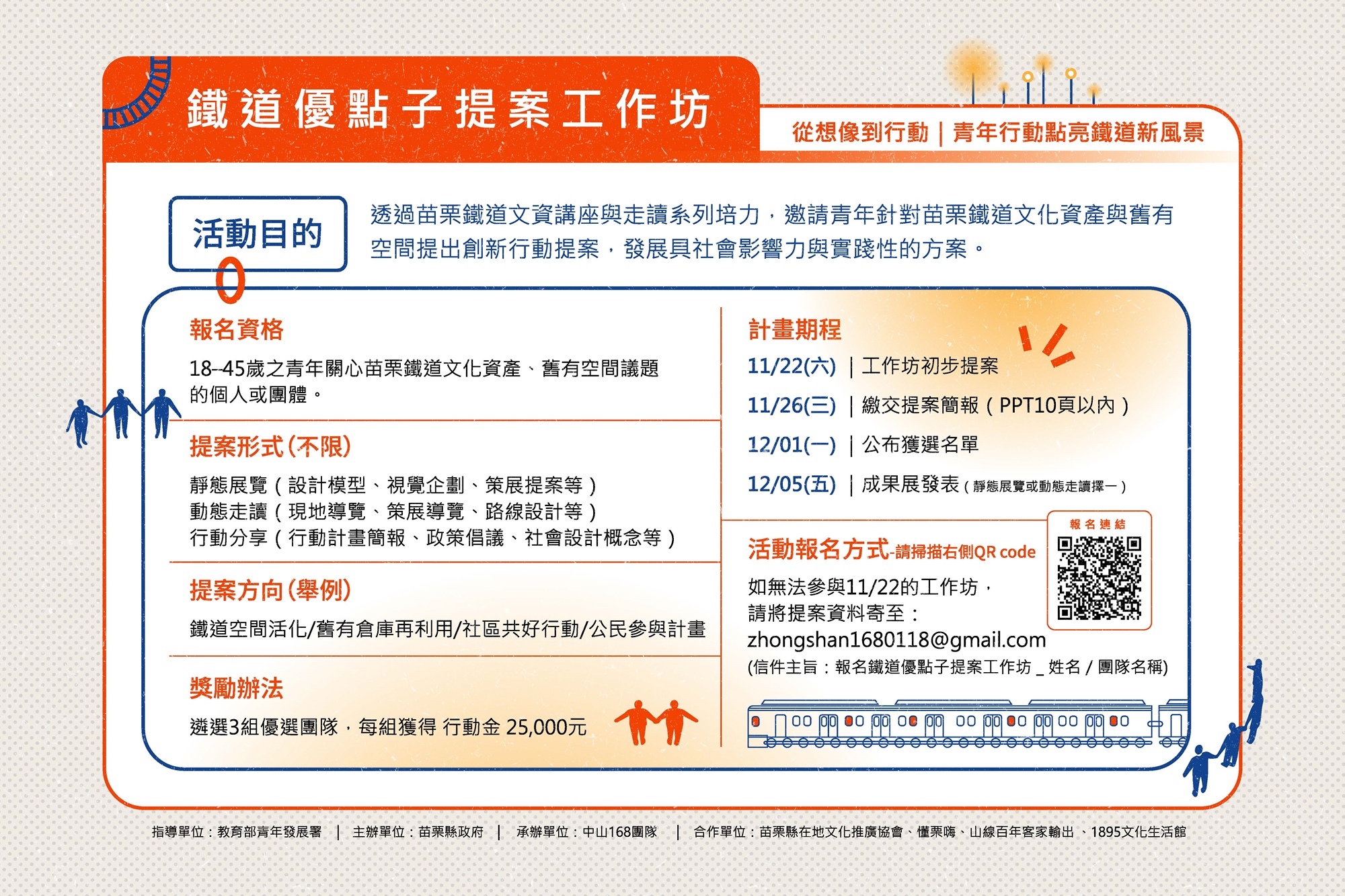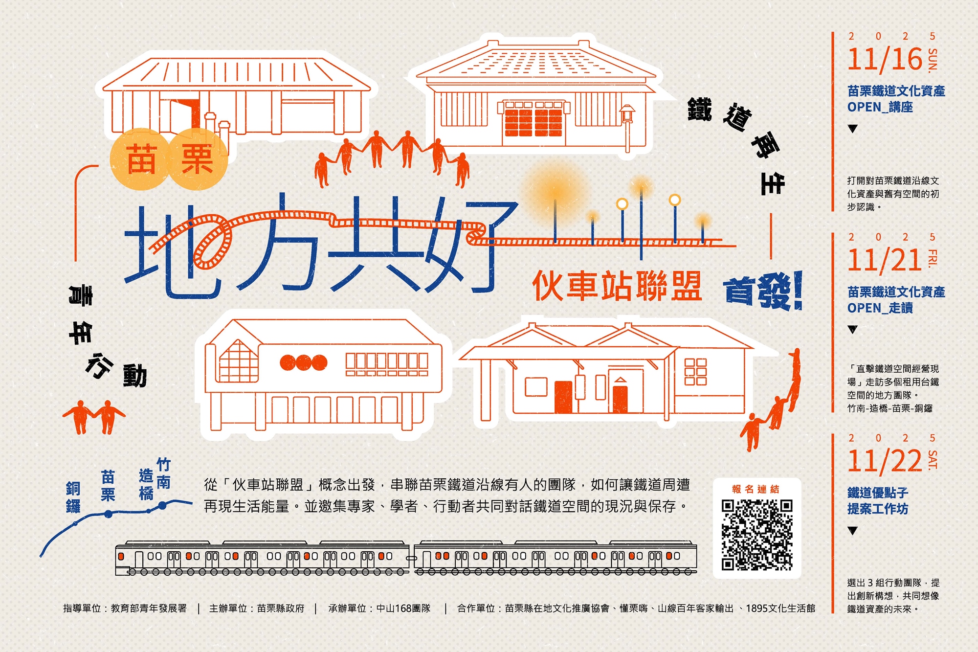 「苗栗伙車站聯盟」以鐵道文化資產——竹南中山168為起點,沿著鐵路串聯造橋、苗栗與銅鑼三站地方團隊,透過【講座 × 走讀 × 提案】系列活動,邀集青年與地方團隊共同探索鐵道舊有空間的再生可能。