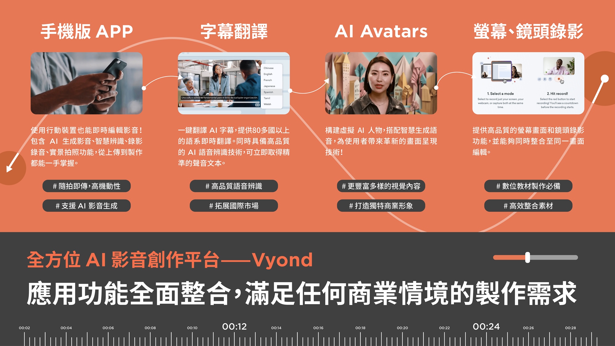 生成式 AI 正在重塑內容創作的規則。從文字、圖片到影片,AI 已不只是工具,而是驅動新世代溝通力的引擎。本次研討會將帶您掌握 2025 AI 影音發展趨勢,了解 Vyond 如何讓 AI 技術真正落地,轉化為每個人都能運用的影音生產力。