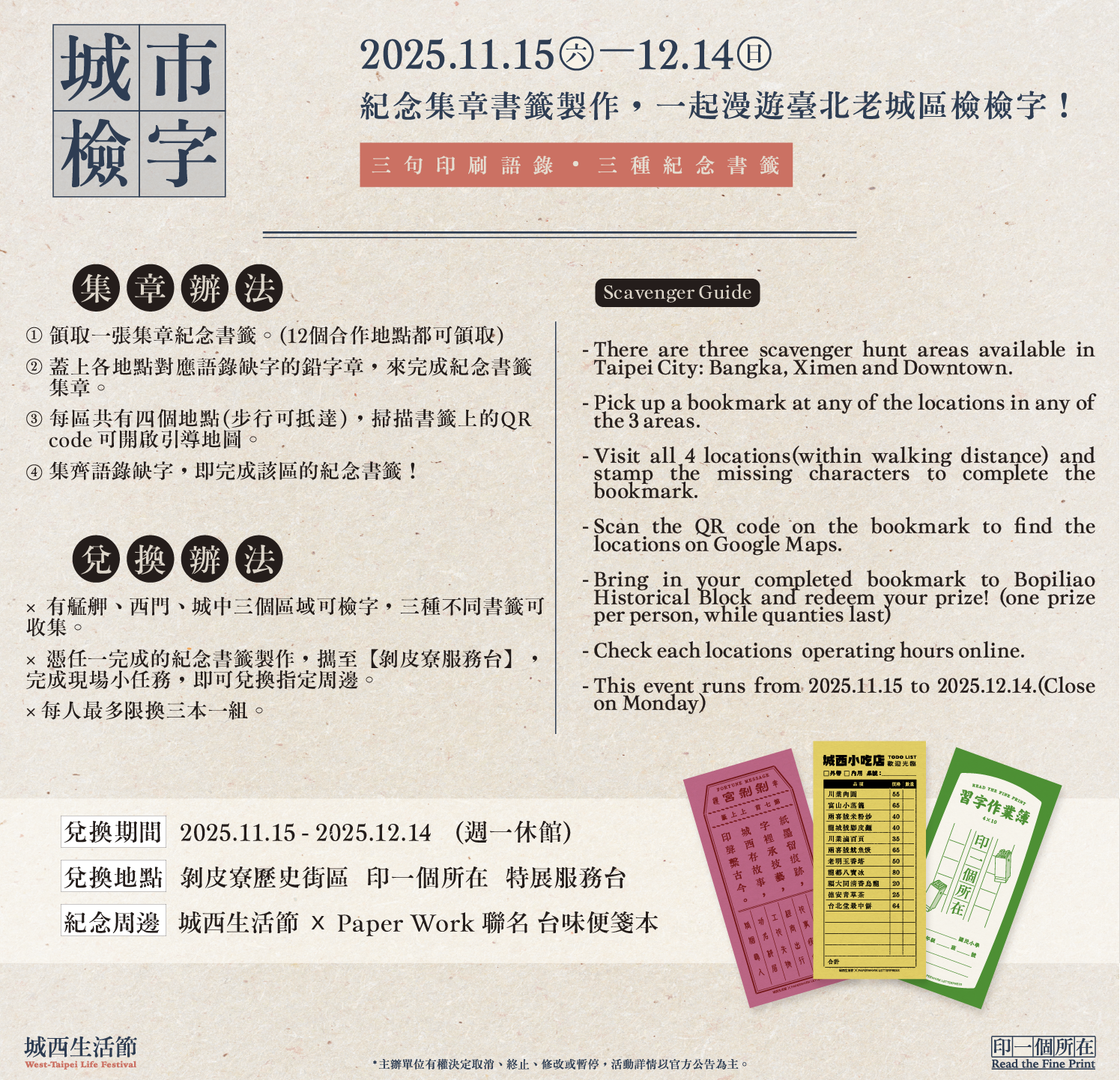 × 憑任一完成的紀念書籤製作,攜至【剝皮寮服務台】,完成現場小任務,即可兌換指定周邊。