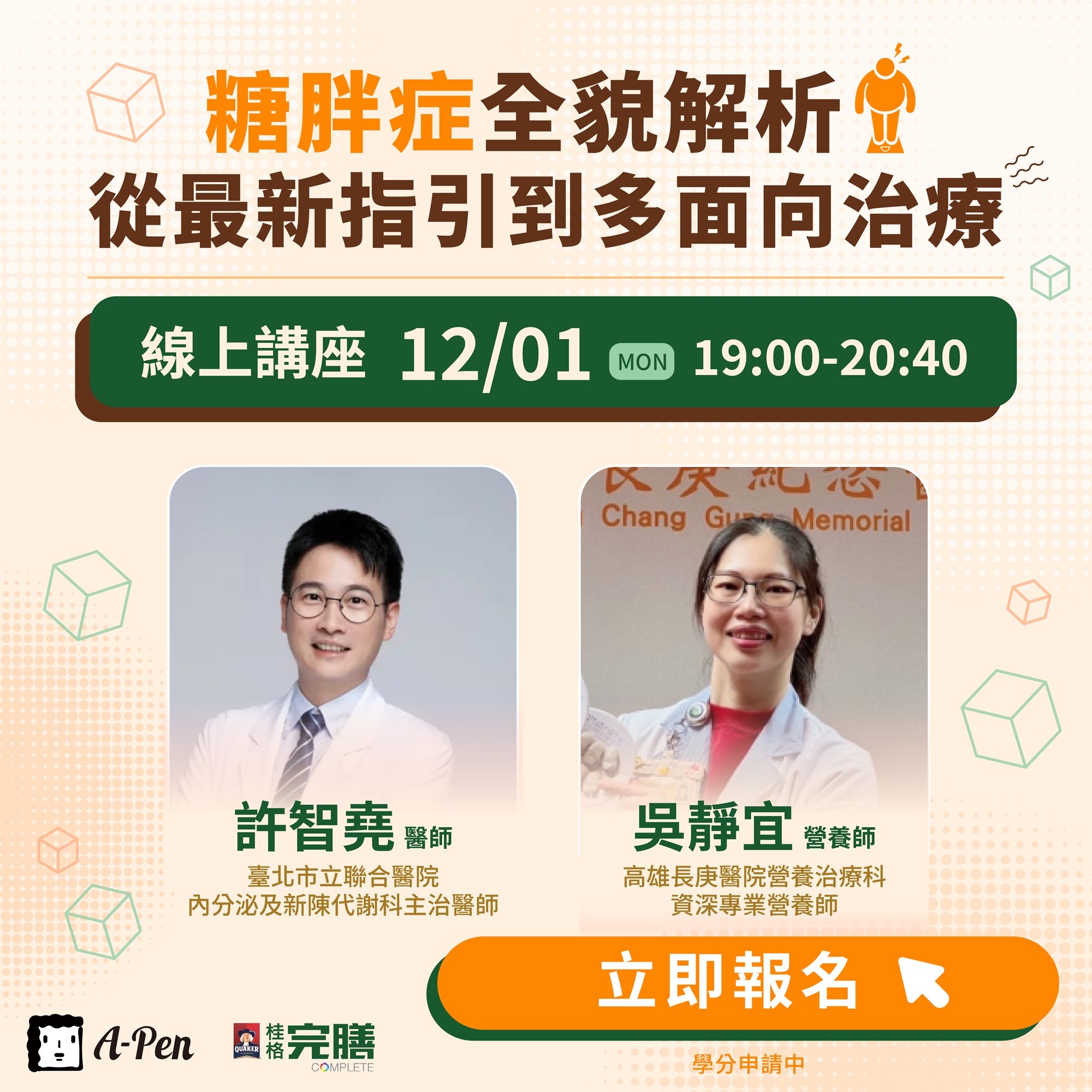 A-Pen特別邀請擁有豐富經驗的許智堯醫師與吳靜宜營養師,聯手推出「糖胖症的診斷與治療趨勢」線上課程。課程將從糖胖症的全球發展趨勢與診斷標準著手,深入解析輔助治療指引與臨床案例,並探討營養支持在糖胖症治療中的關鍵角色。學員將學習如何依照病情選擇口服營養補充品,以及如何進行有效的個別化飲食指導,協助患者達到最佳治療效果。