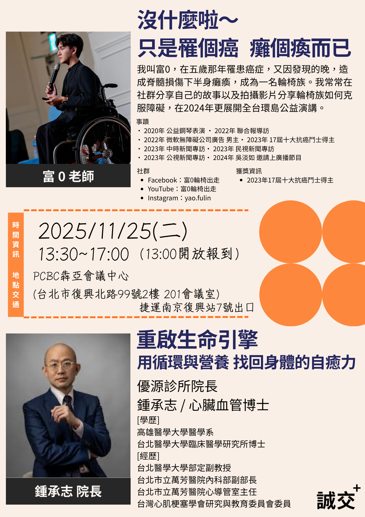 【沒什麼啦~ 只是罹個癌 癱個瘓而已】27歲抗癌鬥士姚富菻,5歲罹患淋巴癌、下半身癱瘓當生命不能走路,依然能溫暖前行2024 年起,開啟了全台環島演講行程姚富菻老師用生命告訴我們:當身體受困,靈魂依然可以飛翔感受這股撼動人心的力量【重啟生命引擎 用循環與營養找回身體的自癒力】你的身體,其實比你想的更有力量當循環順暢,營養能量自然流動修復、代謝、自癒的開關,也將重新啟動這場講座將帶你了解:心血管循環的重要 × 癌後營養復原讓身體回歸平衡,讓生命再次啟動
