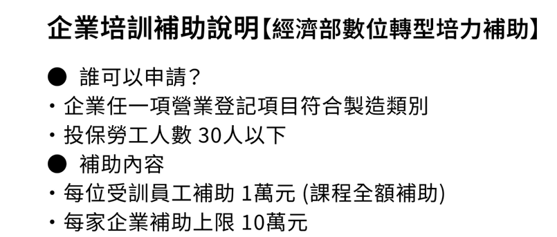 💰 政府補助:適用經濟部「30人以下中小企業數位轉型培力補助」