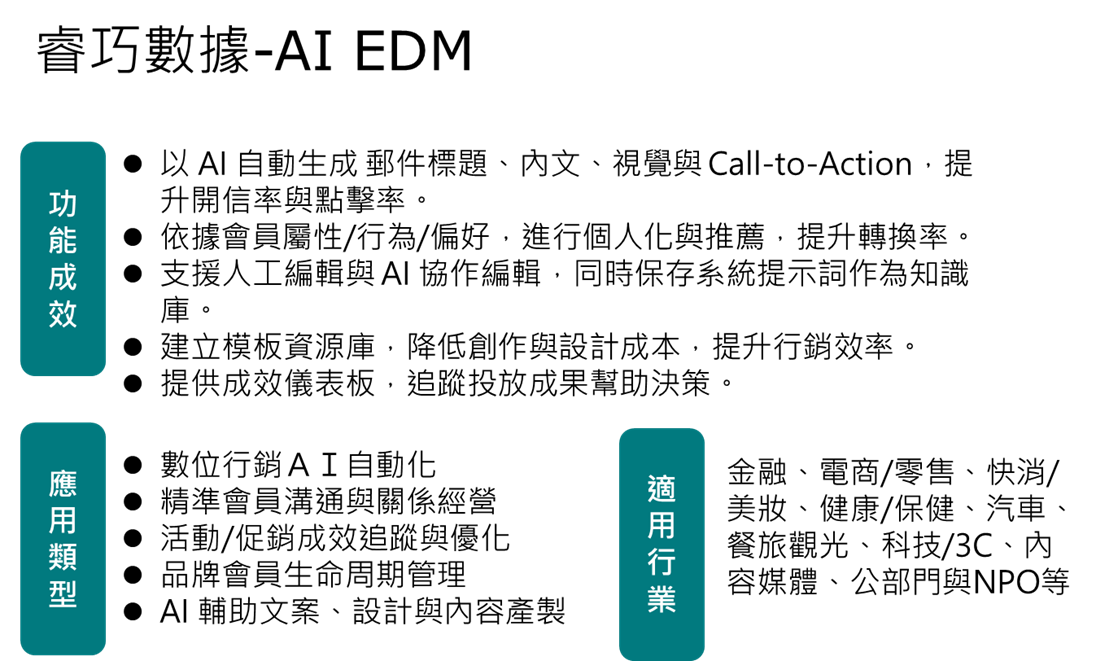 - 學習使用睿巧數據 AI EDM 工具,生成可直接發送的行銷郵件