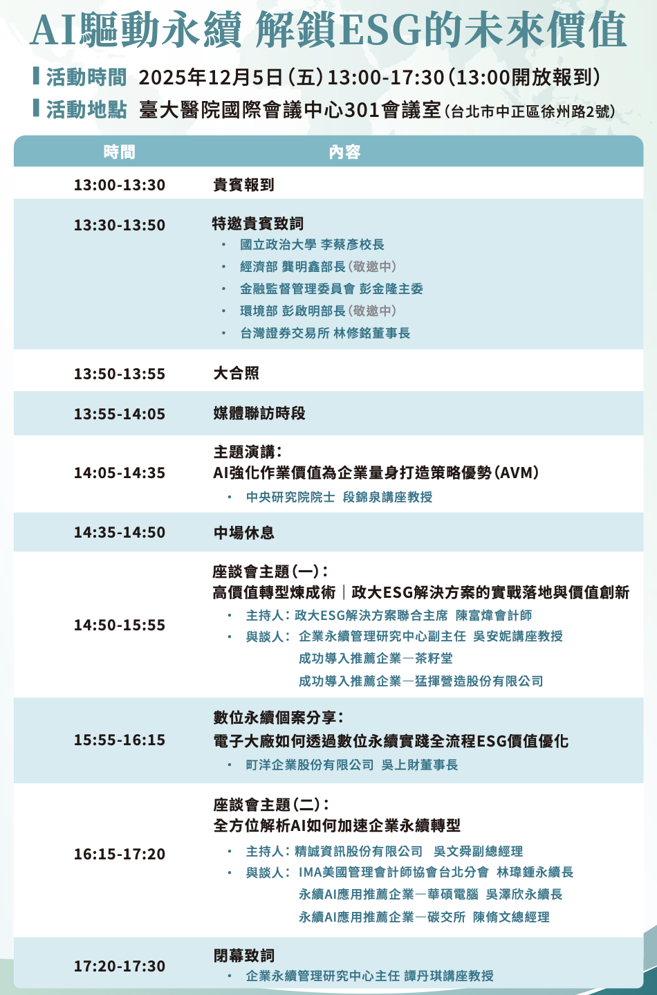 | 14:50-15:55 | 座談會 (一):高價值轉型煉成術|政大ESG解決方案的實戰落地與價值創新 |