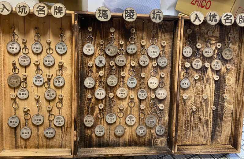 ⮕前往「寄命土地公廟」了解礦工翻牌儀式。特製樟木姓名鑰匙圈,比擬翻牌的象徵意義與了解當年礦工的薪資制度。