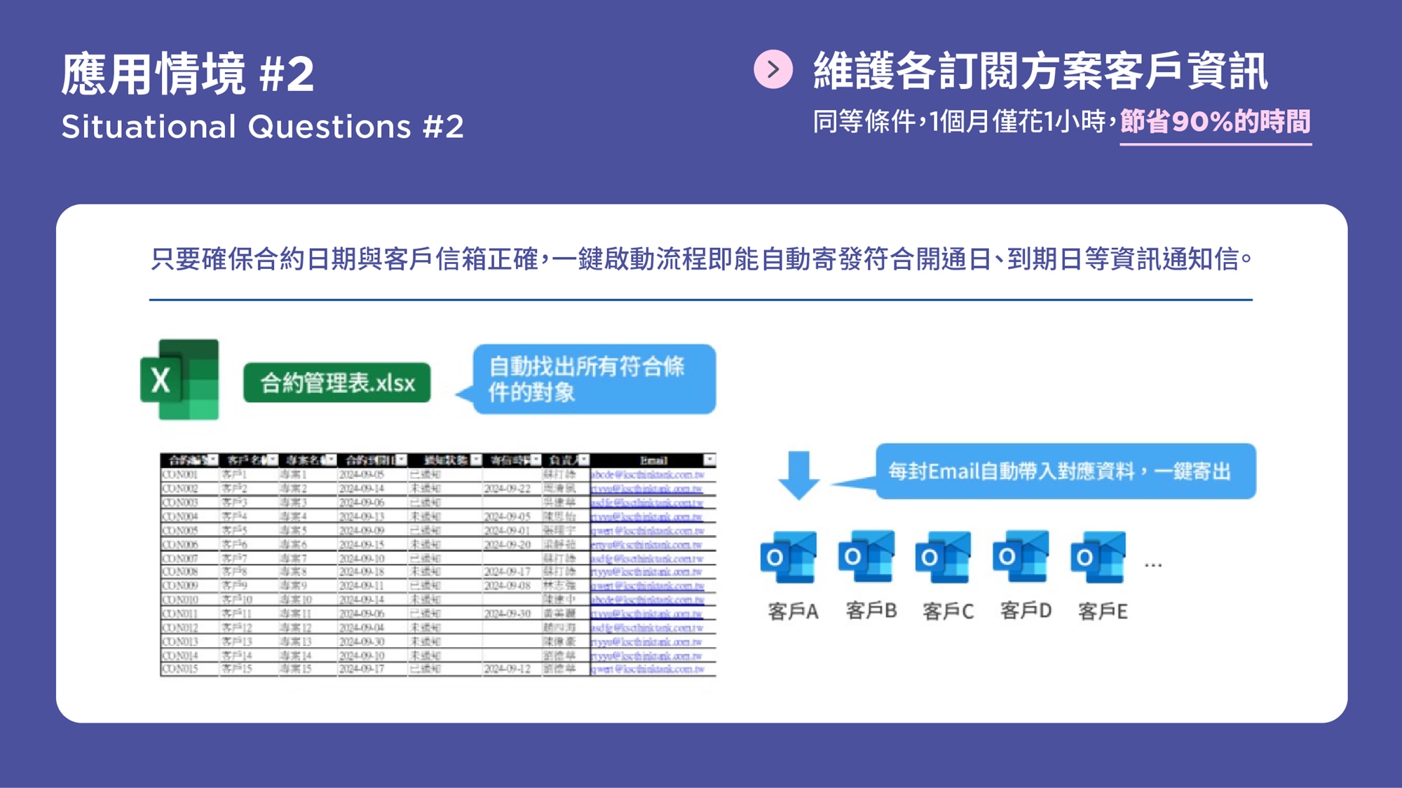 - 簡單完成流程自動化:一鍵完成定期通知和回覆彙整,降低處理重複性工作時間