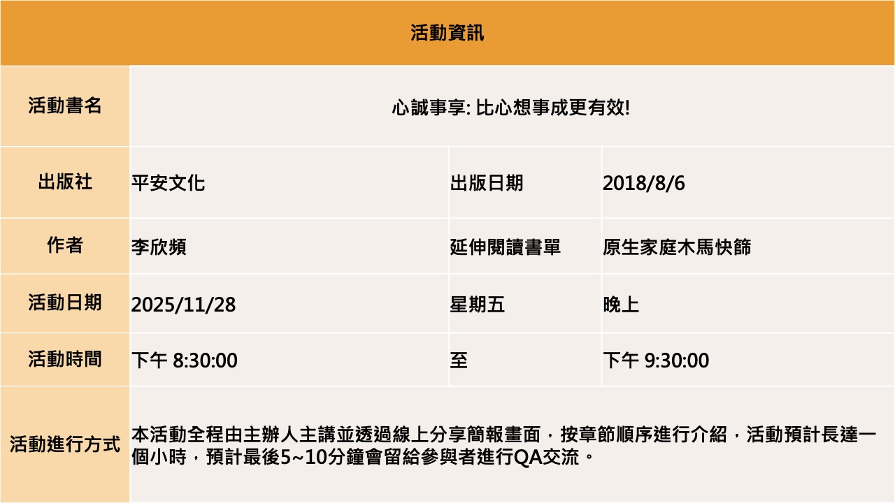 【BookBook預約線上讀書會】心誠事享: 比心想事成更有效!