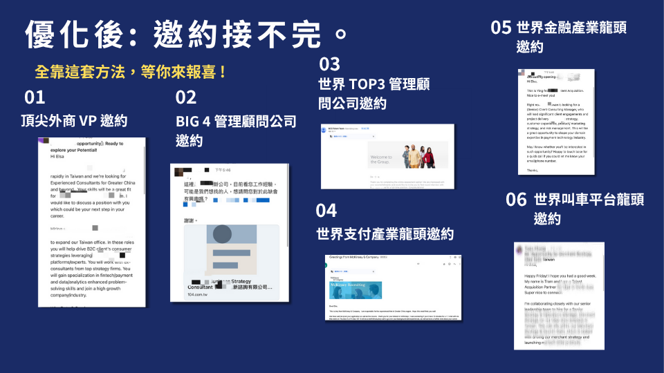 我們會教你怎麼用專案經驗、課外活動、證照等經歷,寫出有邏輯、有價值的內容,讓外商看到你解決問題的能力,而不是只看學歷。