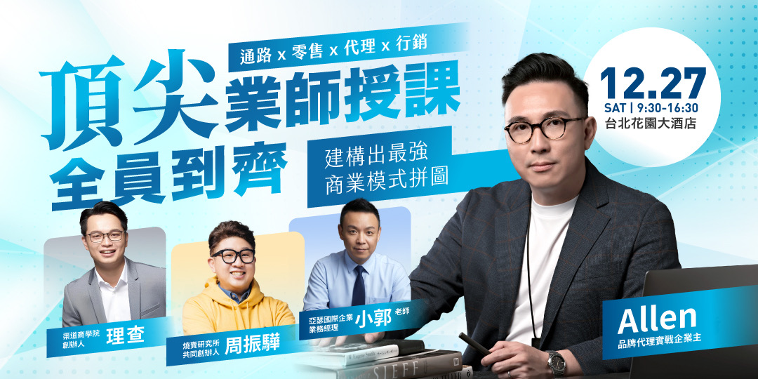- 主題: 頂尖思維 x 品牌代理:4大商模引擎,4位業師的變現藍圖!