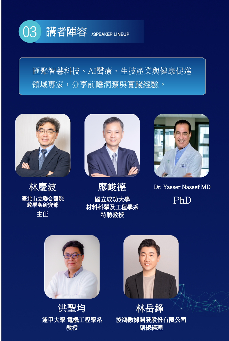 本次研討會邀請五位跨領域專家,從政策、科研、臨床與產業角度解析AI時代的健康新思維:
