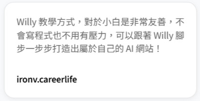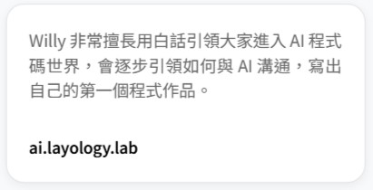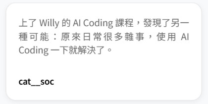 目前全心致力於 Vibe Coding 教學,特別幫助非工程背景的人上手,已帶領超過 200 位學員掌握 Vibe Coding,讓人人都可以創造屬於自己的數位產品。