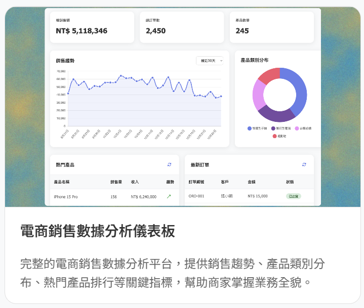 透過 AI Coding,將複雜的數據轉化為直觀的視覺化 Dashboard。讓數據自己說話,為你的業務決策提供強有力的支撐。
