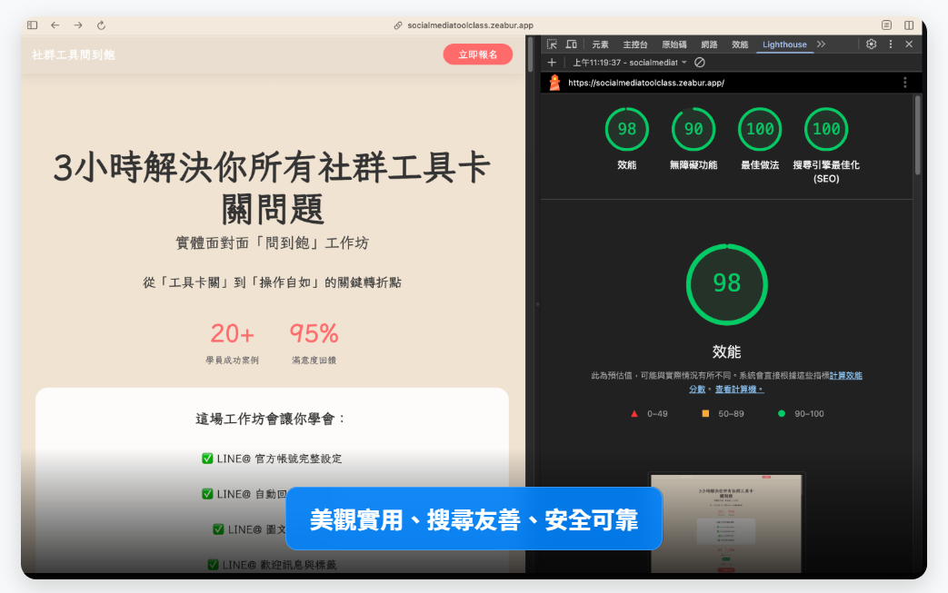 進階階段,我們打造接近商用級的 MVP,包含 SEO 優化、資安設計、響應式布局等專業功能。重點是學會如何突破線上 AI 工具的限制,開發出真正可商業化的產品。