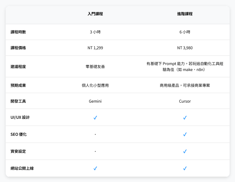 入門課程則專注於基礎概念建立,使用 Gemini工具。建議有基礎的學員直接選擇進階課程。