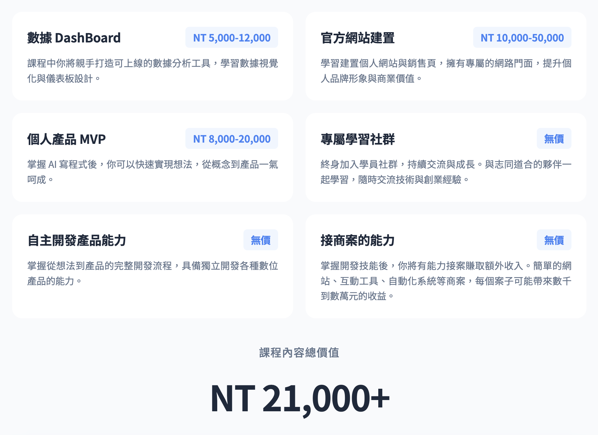 透過三個真實商業場景:數據 Dashboard、官網銷售頁、個人數位產品 MVP。每個案例都從規劃、開發到部署完整拆解,讓你看懂每一步怎麼做、為什麼這樣做。做完三個,你就掌握整套可複製的開發流程。