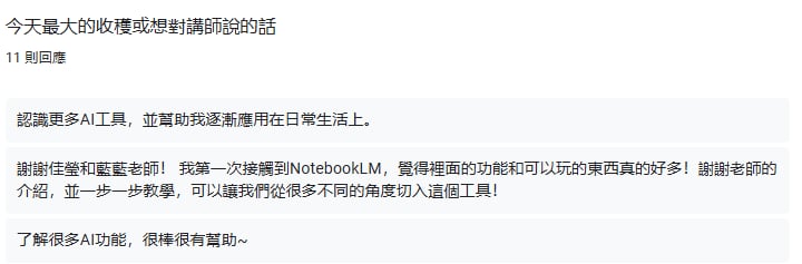我們的線上課進行錄影,錄影檔案將會保留一個月;同時,我們也會將上課的音檔上傳到notebookLM,提供給學員做課後問答使用。