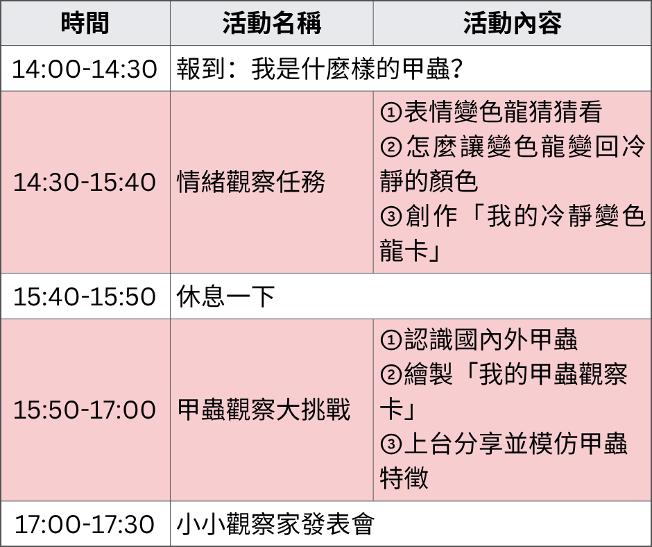 Sue 是一隻懂得觀察情緒的變色龍,當她緊張時會變色,當她冷靜時會慢慢恢復原來的顏色。在這場營隊裡,孩子們將跟著 Sue 一起觀察甲蟲、觀察自己、學習甲蟲的「淡定力」,透過覺察、討論與創作,學會與情緒和平相處。