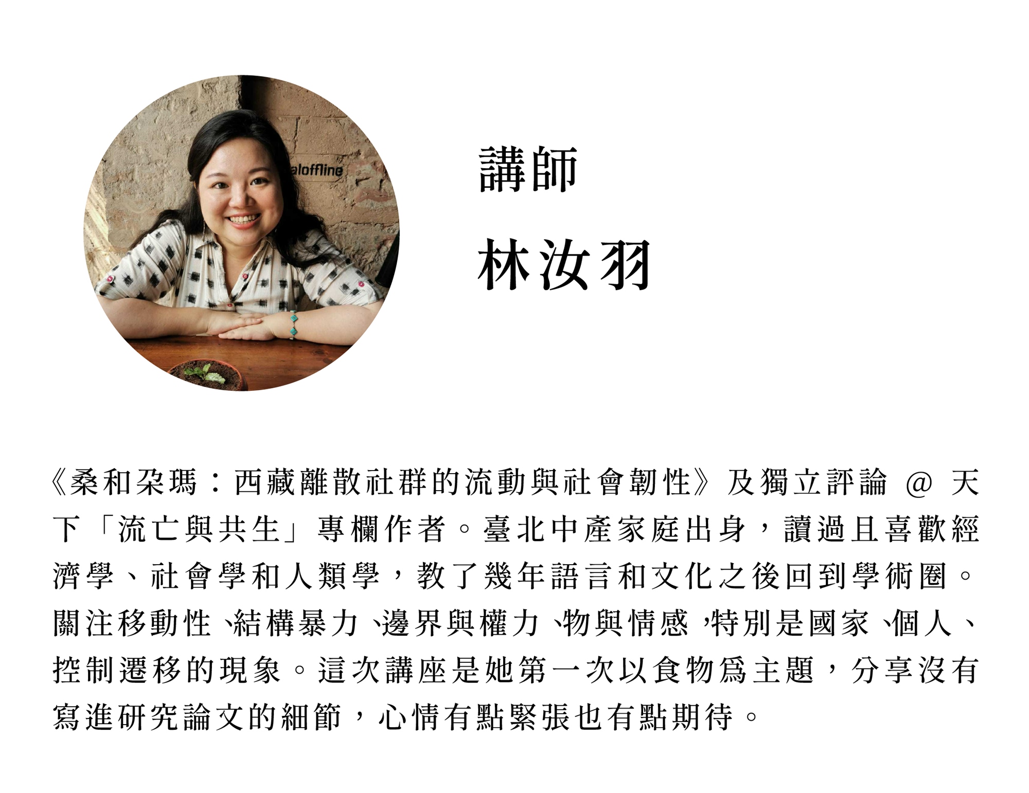 這場講座環繞著流離遷移、文化揉合、風土適應的故事,將介紹十道大家或許陌生、或許熟悉的西藏飲食,以及食物流轉變化的故事,帶大家從高原的餐席移動到南印度的山谷,再到西歐城市的多族裔地景,照見藏人流離生命之路。