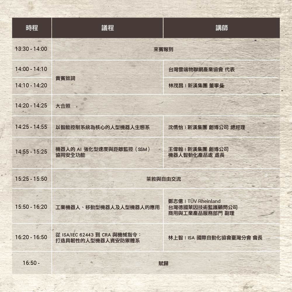 - 2025 年 11 月場主題:「以軟體定義機器人,共榮人型機器人產業鏈」──聚焦機器人核心技術、產業趨勢、生態系發展與機器人國際標準規範,完整剖析產業趨勢。