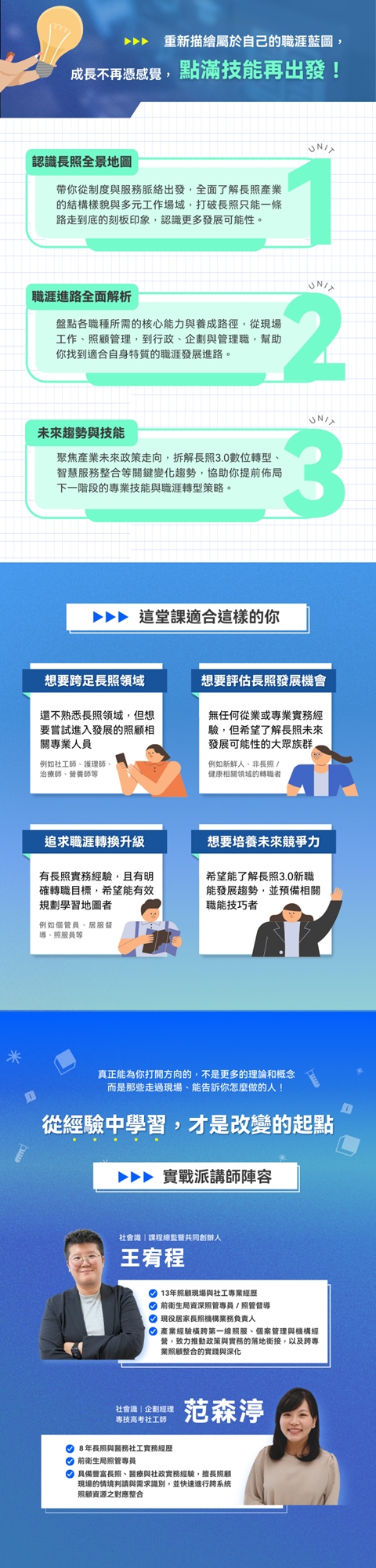 本課程將帶你認識長照產業的整體結構,了解職能發展的專業地圖,