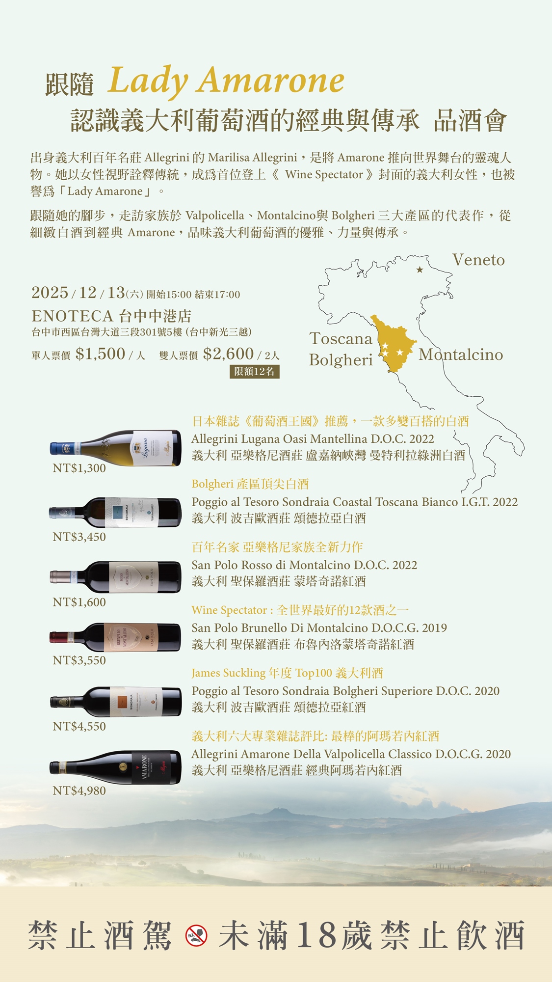 這場品鑑會將跟隨她的腳步,一次集齊家族在 Valpolicella、Montalcino 與 Bolgheri 三大頂級產區的代表作。從經典渾厚的 Amarone 到細緻優雅的白酒,讓我們深度體驗義大利葡萄酒無與倫比的力量、雅緻與傳承。一趟不容錯過的味蕾之旅,即刻啟程。