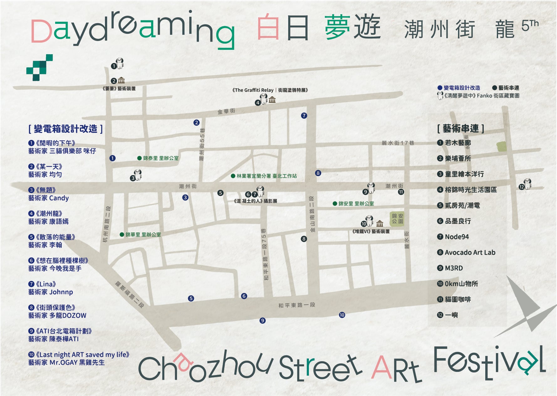 10月17日於台北大安潮州街展開,開啟為期一個月的街區藝術行動 2025年10月17日至11月23日,《2025潮州街龍》將以「白日夢遊」為主題,在台北市大安區潮州街正式展開。由創客吧有限公司主辦,本次活動串連藝術家、藝廊、在地場域與社群,將街區轉化為一座「無牆美術館」,邀請觀眾一同夢遊城市的日常。