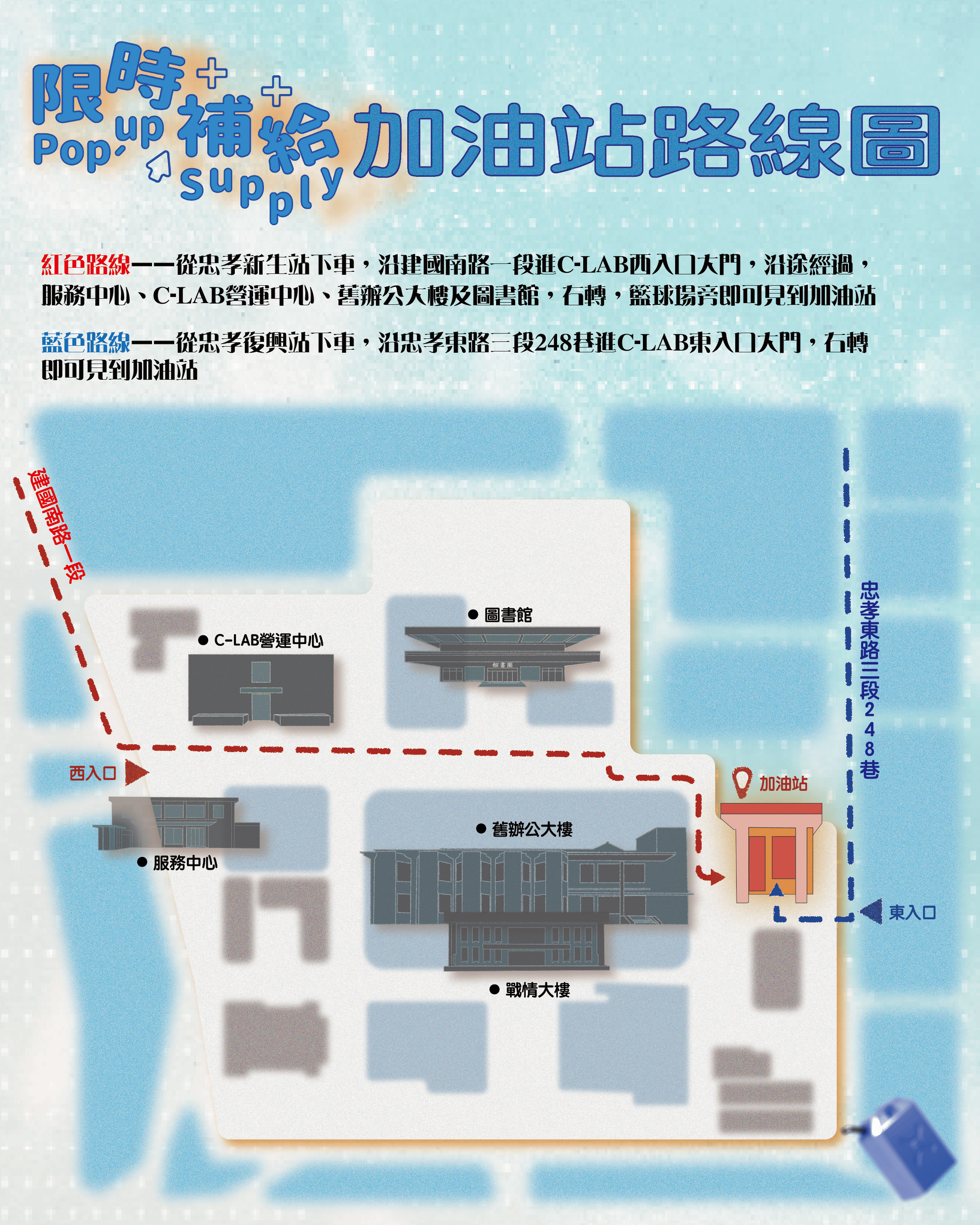 為了活絡 C-LAB 加油站區域,我們特別推出「限時補給 Pop-up Supply 」企劃。這是一系列結合場域歷史、文化能量與快閃體驗的活動。加油站前身為軍用車輛的儲油廠,象徵能量的儲存與補給;如今轉化為實驗文創店,將在2025年11月至2026年1月間,每月的一個週末邀請不同的藝文創作者駐場,帶來包括陶瓷、圖文、動漫等各種形式的創作展現,讓觀眾在短暫的相聚中,補充文化與靈感的能量。