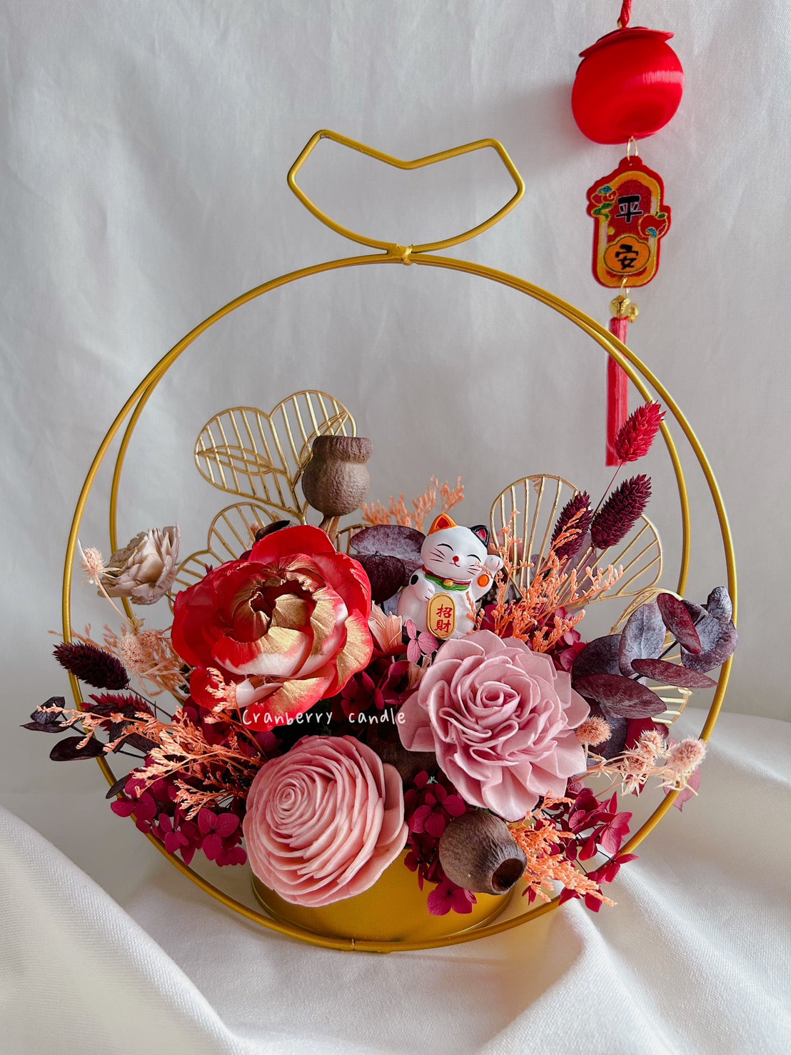運用多樣素材搭配(招財貓-太陽能款、索拉花、棉花、松果、不凋花葉材、兔尾、金色擬真葉材…等)