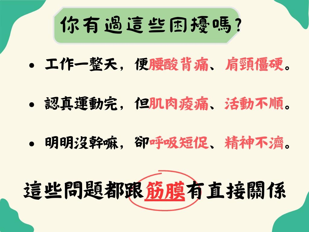 是否工作一整天,便腰酸背痛、肩頸僵硬? 是否認真運動完,但肌肉痠痛、活動不順? 是否明明沒幹嘛,卻呼吸短促、精神不濟? 以上困擾都跟「筋膜」有關係!